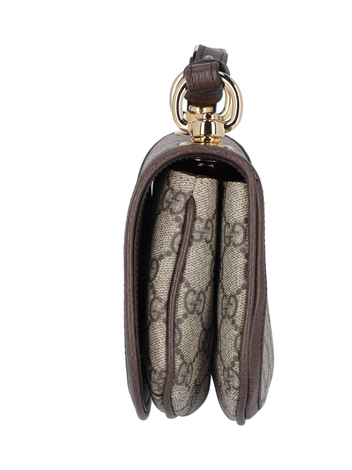 Borsa mini "Blondie" Gucci, in tessuto beige, motivo logo "GG Supreme", finiture in pelle, manico rimovibile in pelle e catena metallica dorata, tracolla regolabile e rimovibile, chiusura patta magnetica, dettaglio logo incrocio "GG" in metallo dorato, una tasca piatta interna, due scomparti interni separati.