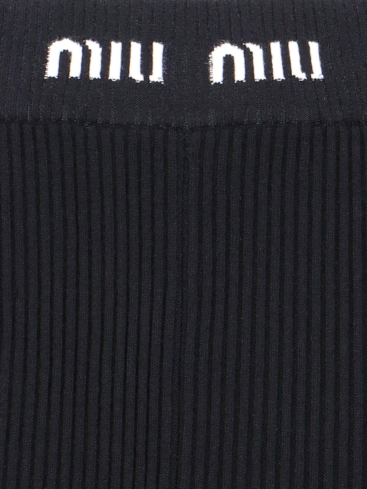 Pantaloni a costine Miu Miu, in tessuto nero, fascai elastica superiore, dettaglio intarsio logo a contrasto fronte, design aderente.