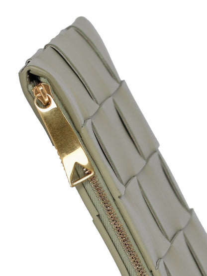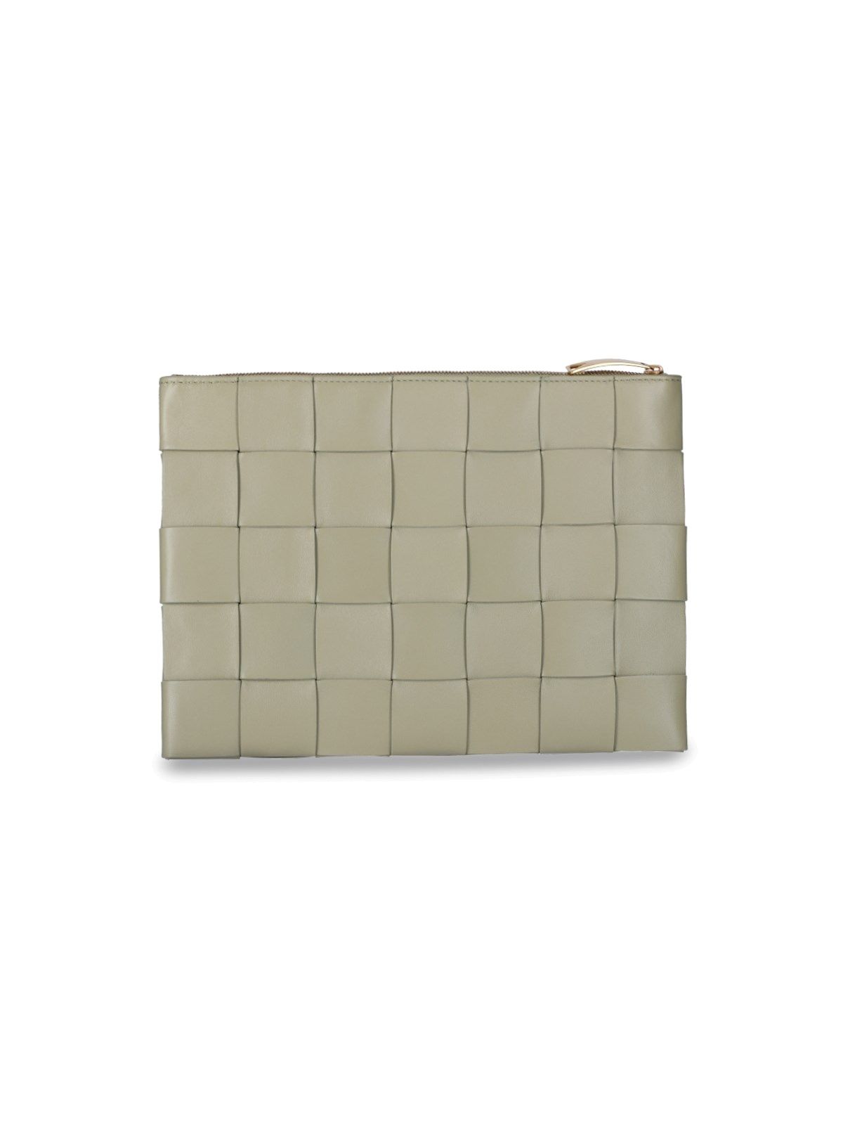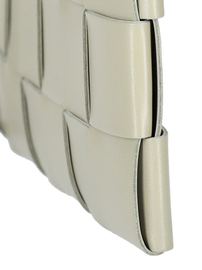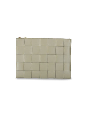 Pouch Motivo Intrecciato Bottega Veneta, in pelle taupe, chiusura zip, una tasca interna, uno scomparto interno principale.