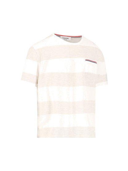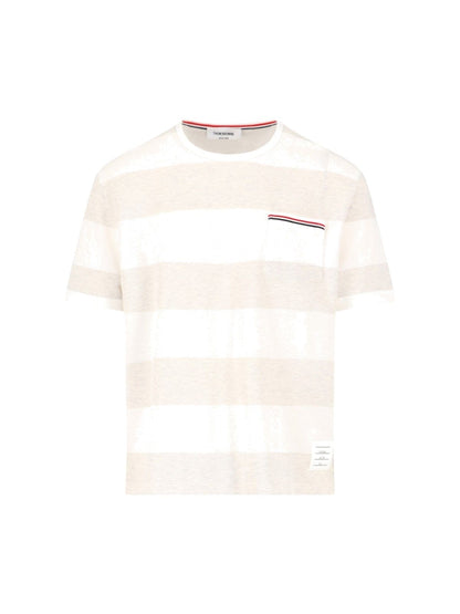 Thom Browne „Rugby Stripe“ T-Shirt aus cremefarbenem Baumwoll-Piqué, beiges Streifenmuster, Rundhalsausschnitt, kurze Ärmel, Brusttasche mit dreifarbigem Detail, weißes Etikett mit Logo unten, seitliche Knopfschlitze, dreifarbiges Ripsband auf der Rückseite, gerader Saum.