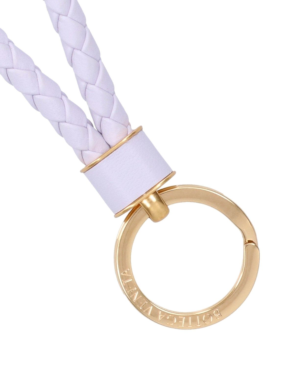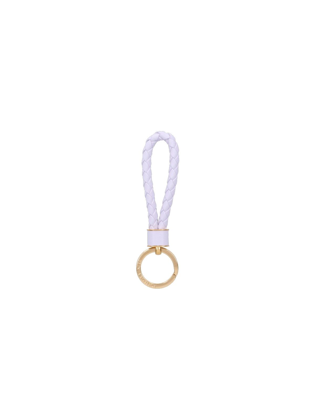 Portachiavi "Intreccio" Bottega Veneta, in pelle viola, tonalità lilla, motivo iconico intrecciato, anello metallico dorato, logo inciso.