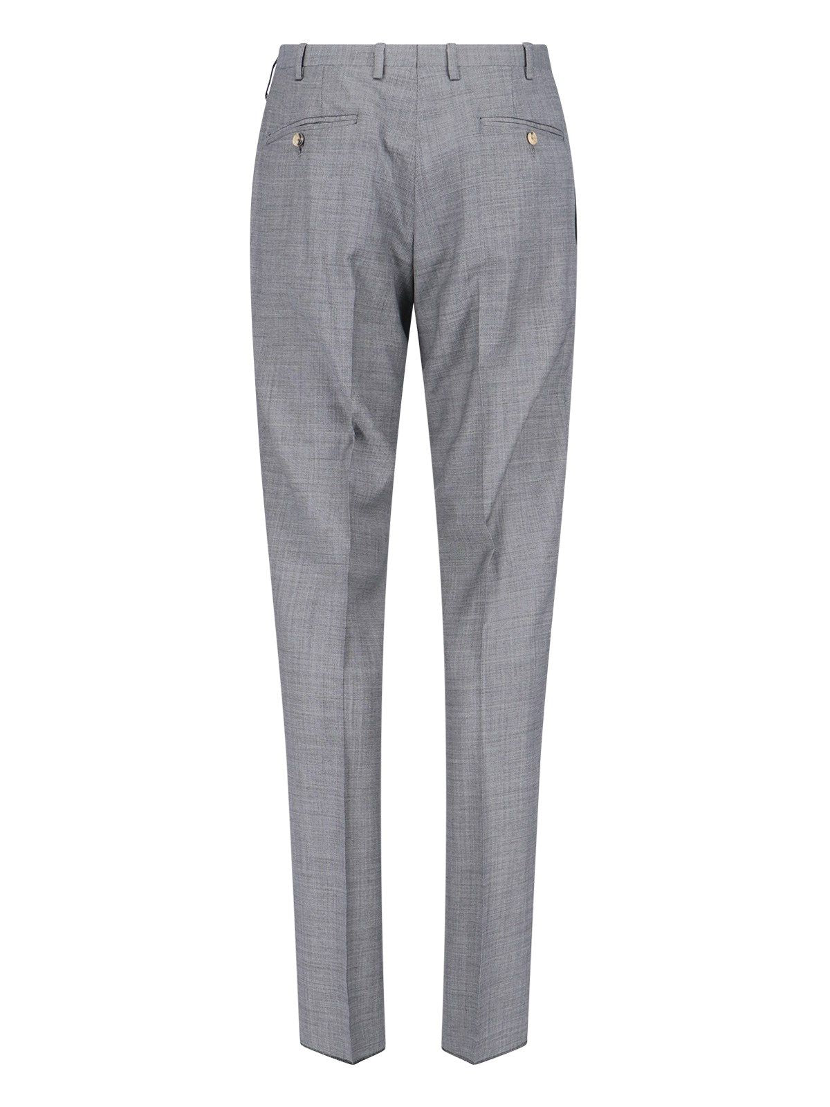 Completo doppiopetto Kiton, in lana vergine grigia, revers a lancia, chiusura bottoni, una tasca petto, due tasche fronte, bottoni polsini, orlo dritto, pantaloni sartoriali, vita media, passanti cintura, chiusura gancio e zip, due pinces fronte, due tasche fronte, due tasche retro, gamba dritta.