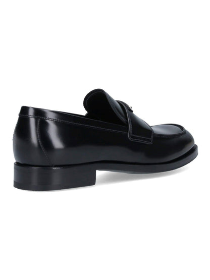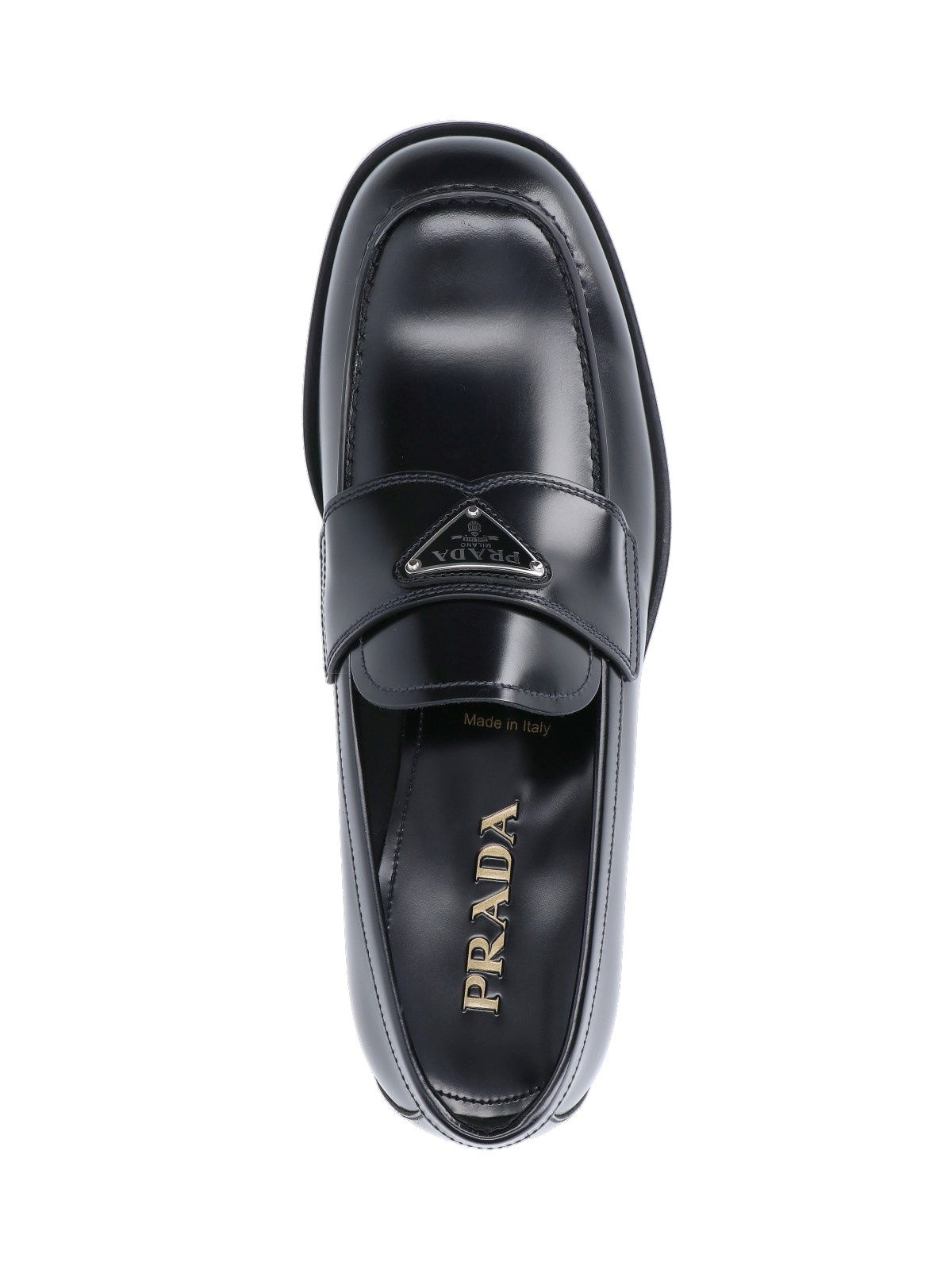 Mocassini in pelle spazzolata Prada, neri, punta tonda, vestibilità slip-on, hardware logo applicato superiore, suola in cuoio.