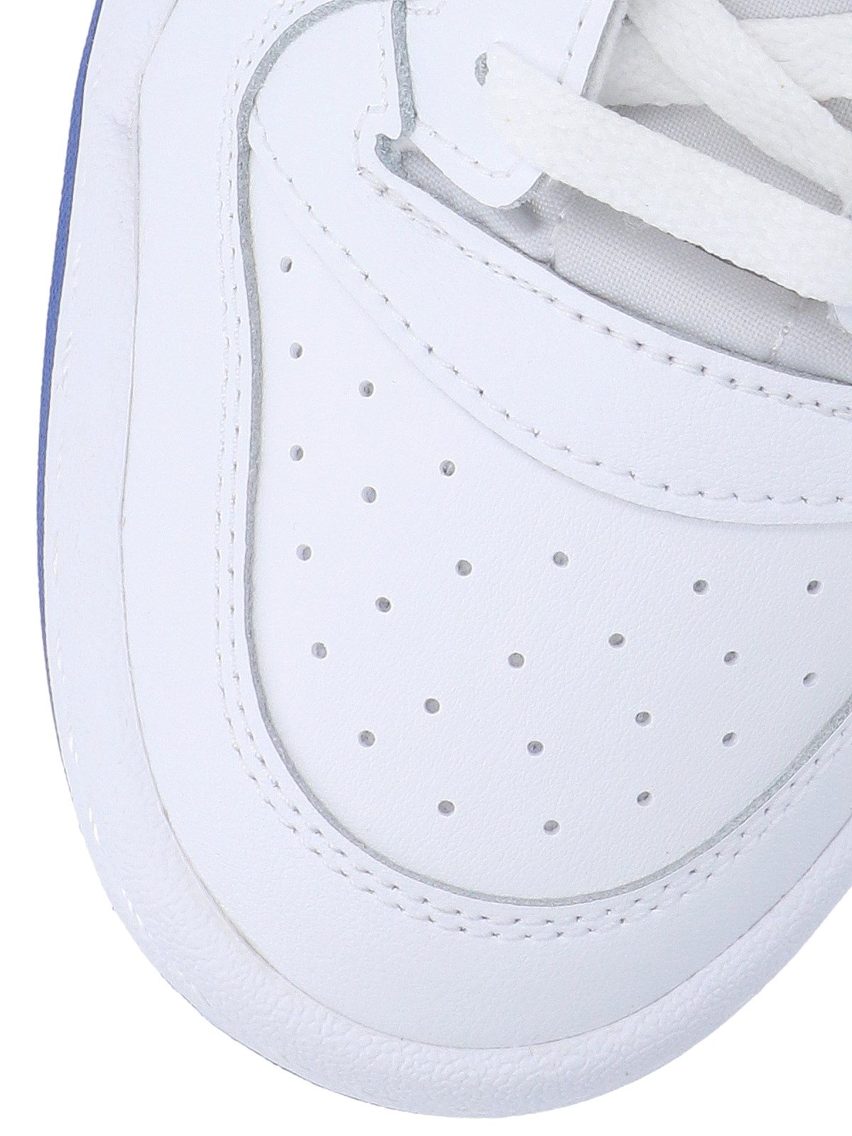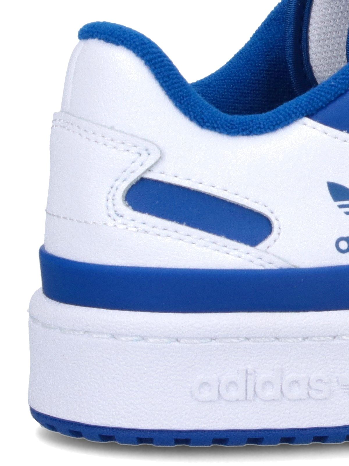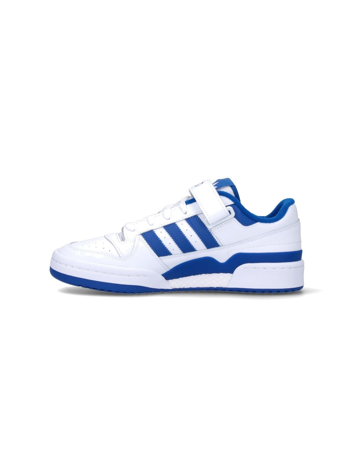 Adidas-Sneaker „Forum Low“, aus weißem Leder, blaue Details, perforierte runde Spitze, Schnürverschluss, Klettverschluss, Zungenlogo-Etikett, ikonisches Seitenstreifendetail, eingraviertes seitliches Logo, Gummisohle.