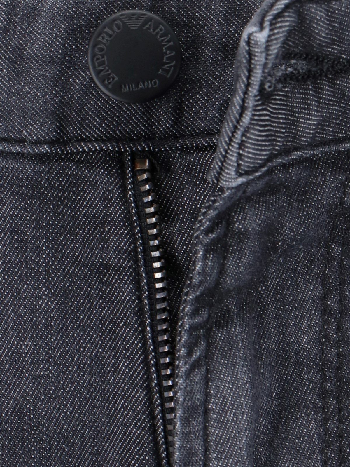Emporio Armani Slim-Jeans aus schwarzem Denim, Gürtelschlaufen, Five-Pocket-Design, Reißverschluss und Knopfverschluss, Ton-in-Ton-Metallic-Logo-Detail auf der Vorderseite, Logo-Patch auf der Rückseite, schmales Bein.