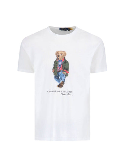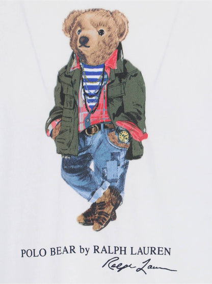 T-shirt "Polo Bear" Polo Ralph Lauren, in cotone bianco, girocollo, maniche corte, stampa multicolor petto, stampa logo a contrasto fronte, orlo dritto.