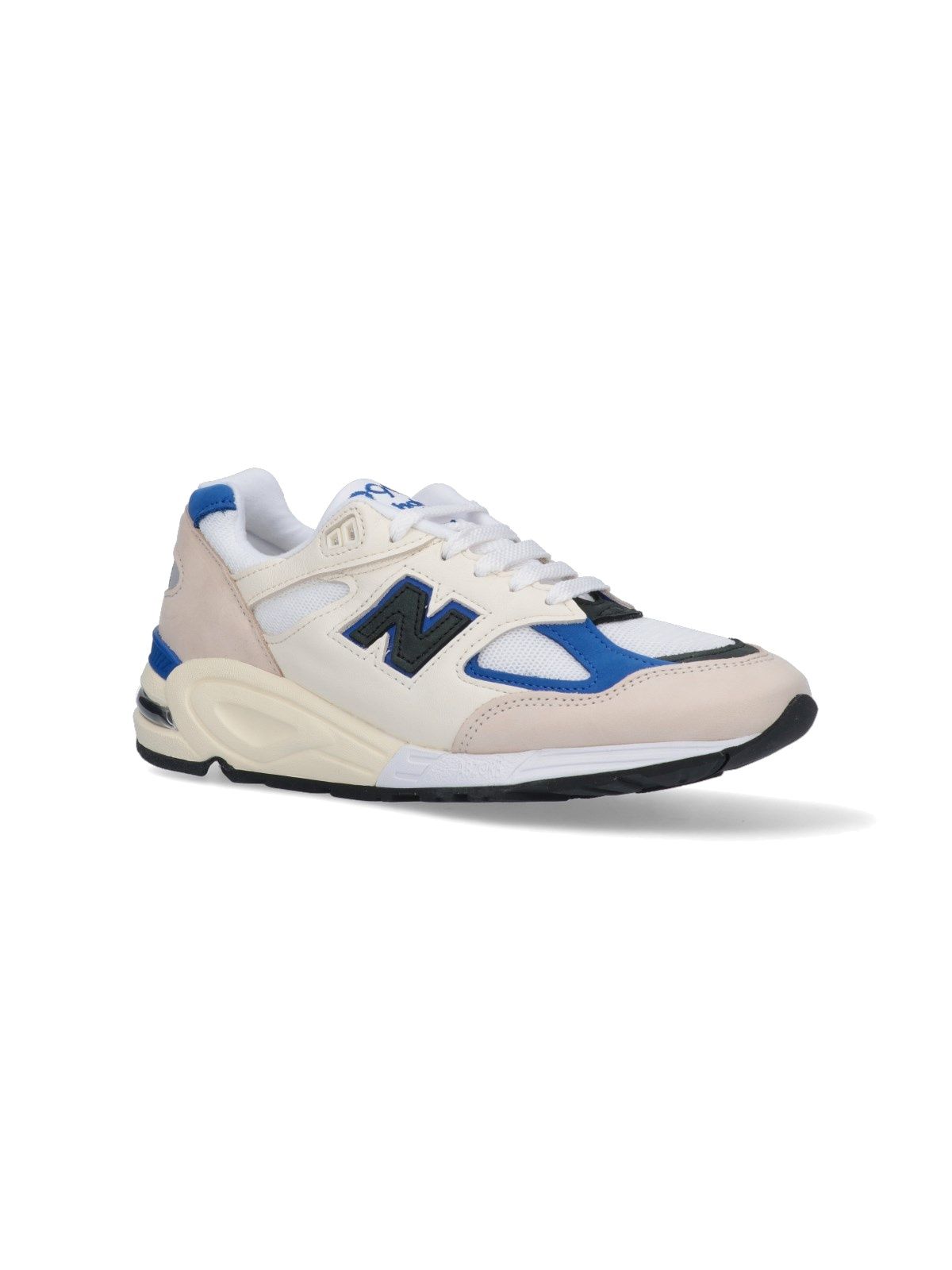Teddy Santis X New Balance "990v2" sneakers, cream and blue leather upper, white mesh details, round toe, lace-up closure, logo embroidery on the tongue, black logo patch on the side, "USA" embroidery on the back, rubber cushioned sole.
