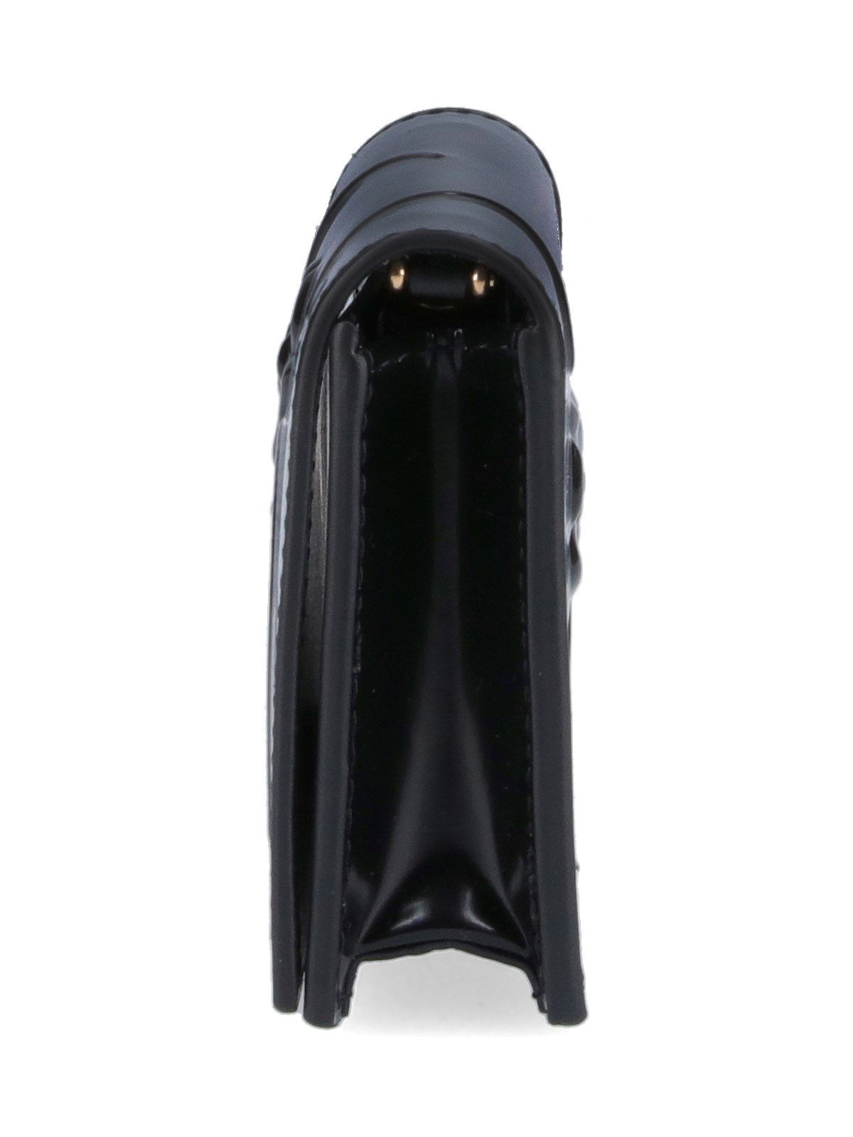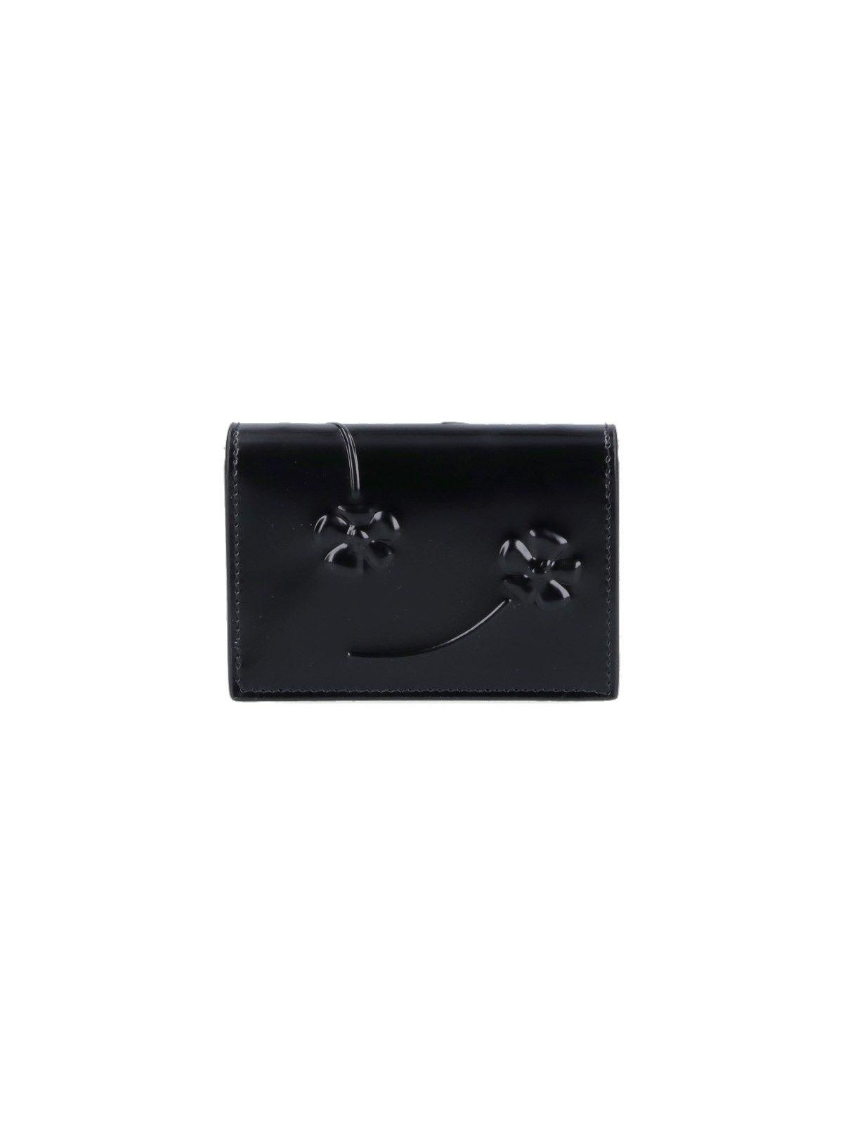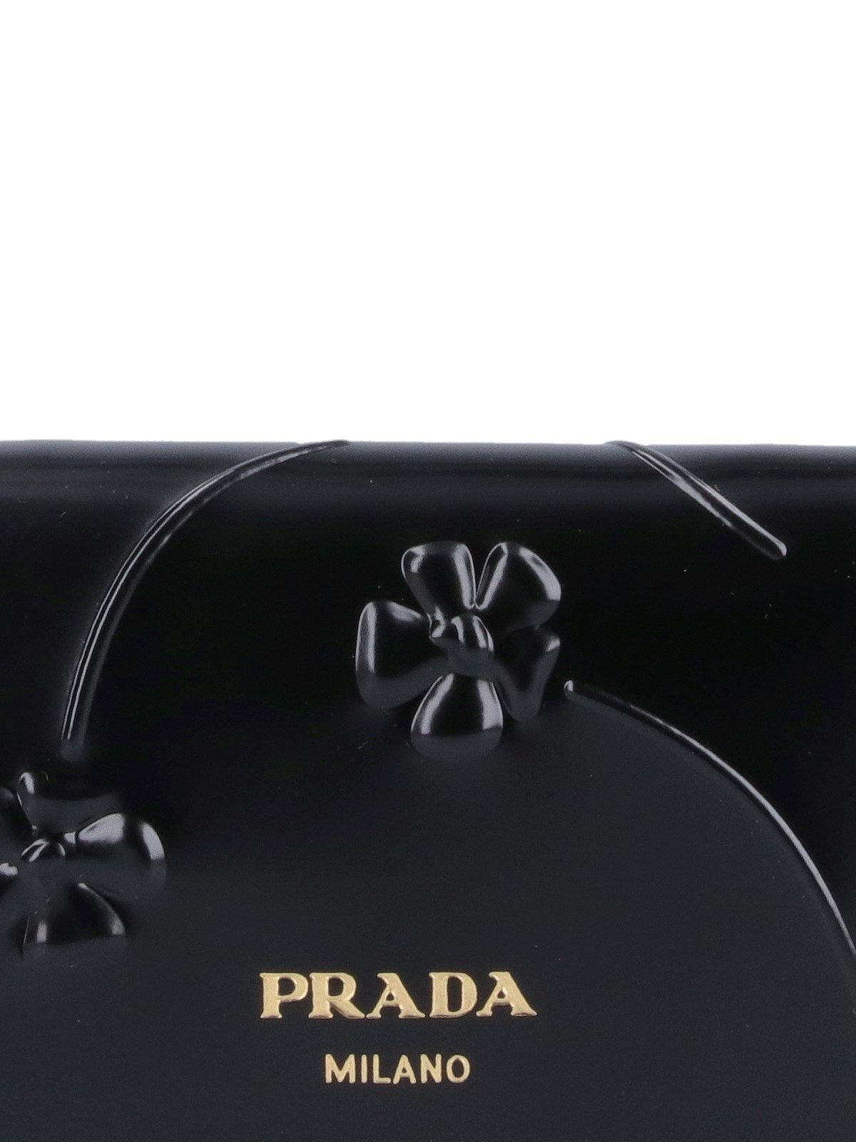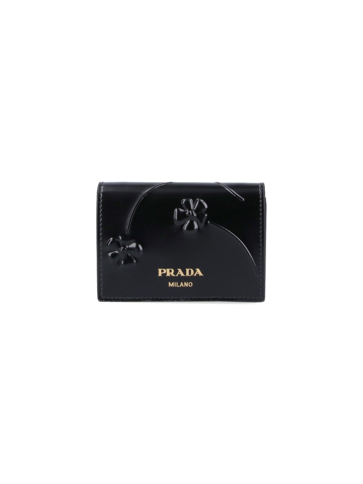 Portafoglio tracolla Prada, in pelle nera, dettaglio inserti floreali, lettering logo dorato fronte, uno scomparto interno principale.