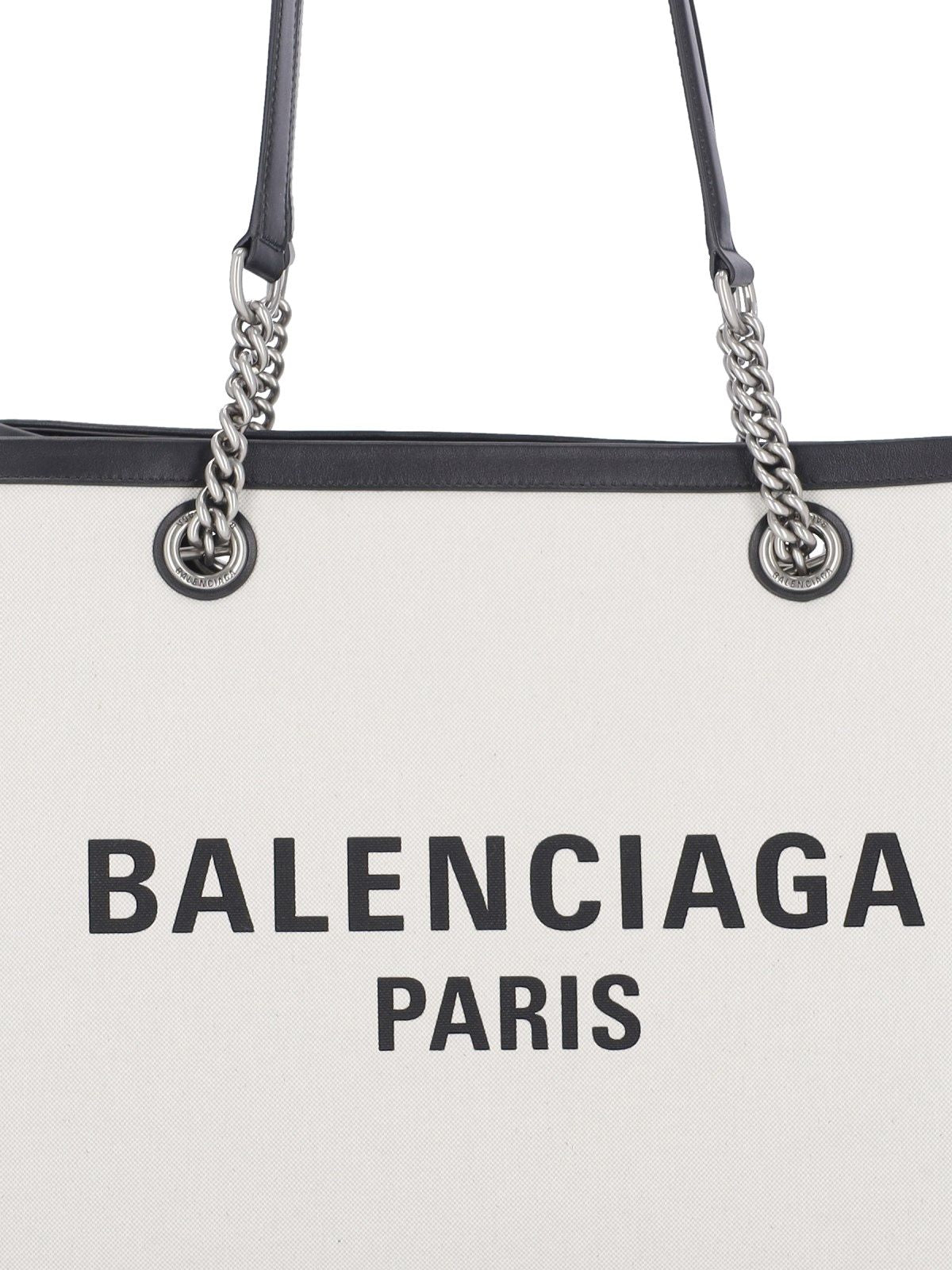 Balenciaga "Duty Free" medium tote bag, in grey canvas, two top handles, leather trim, black logo print on the front, one main internal compartment.