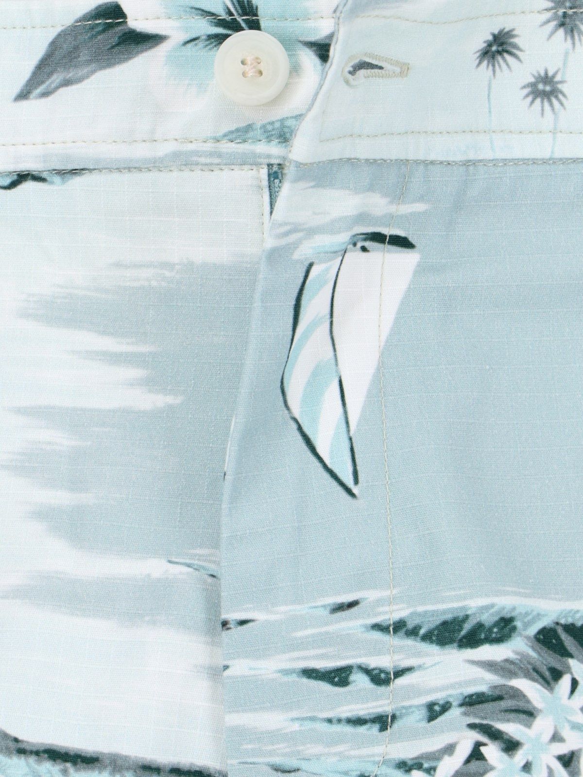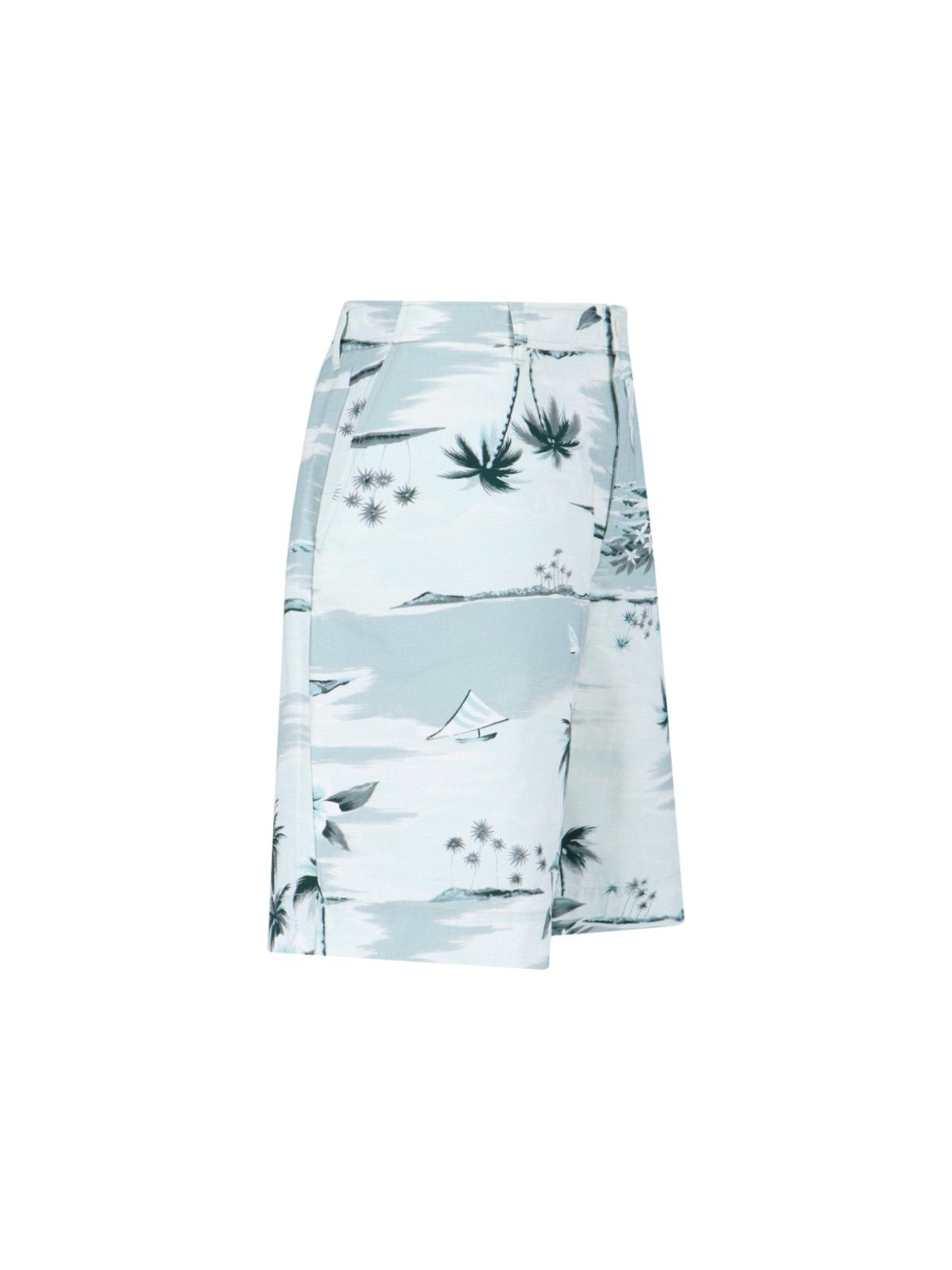 Pantaloncini "Board" Maison Kitsuné, in cotone azzurro, motivo "Hawaiian Landscape" all-over, vita media, passanti cintura, chiusura bottone e zip, due tasche laterali, due tasche retro, patch logo applicato retro.
