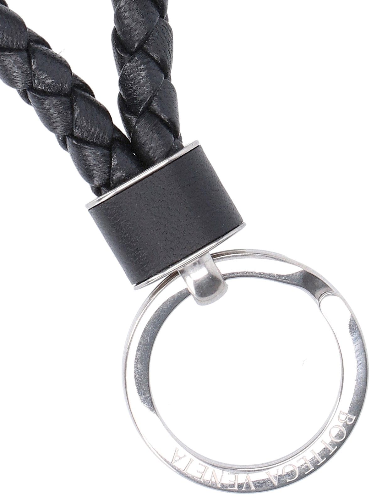 Portachiavi Intrecciato Bottega Veneta, in pelle nera, anello metallico argentato, logo inciso.