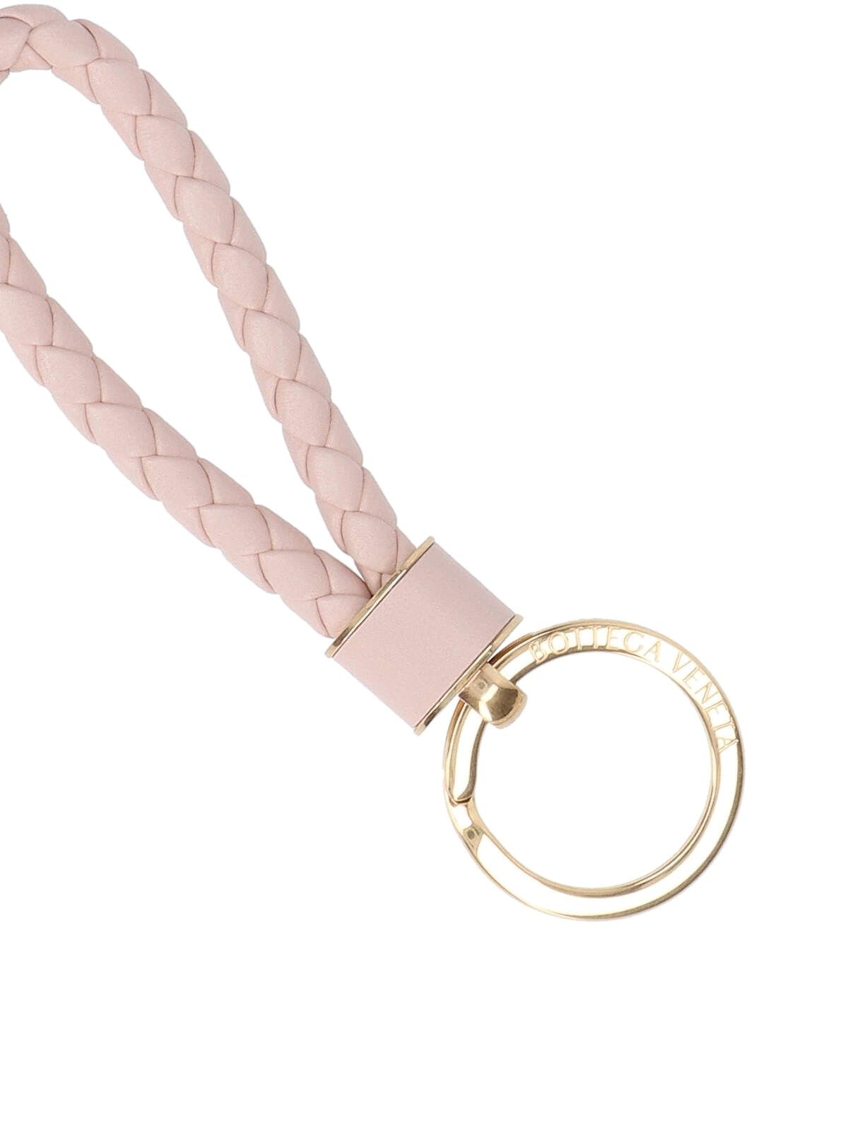 Portachiavi "Intreccio" Bottega Veneta, in pelle verde, motivo iconico intrecciato, anello metallico dorato, logo inciso.
