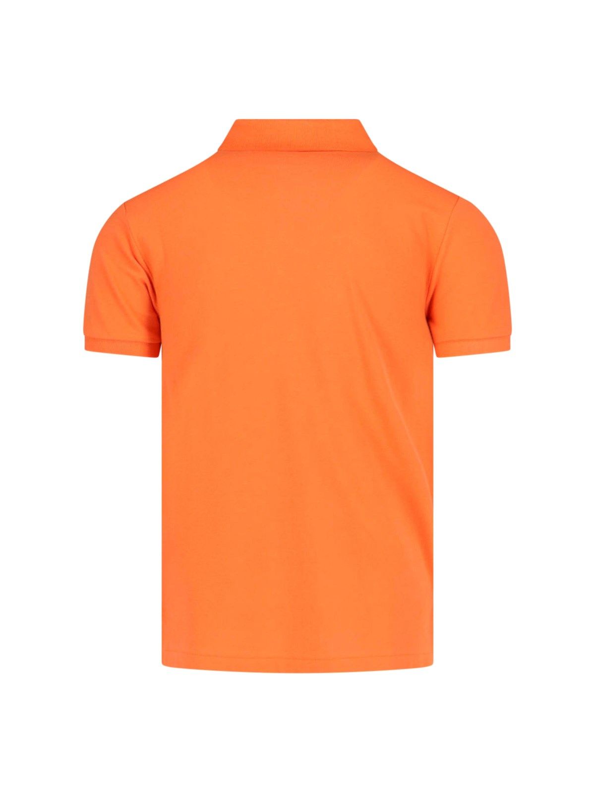Polo logo Polo Ralph Lauren, in cotone arancione, colletto classico, maniche corte, chiusura bottoni, ricamo logo azzurro fronte, orlo dritto.