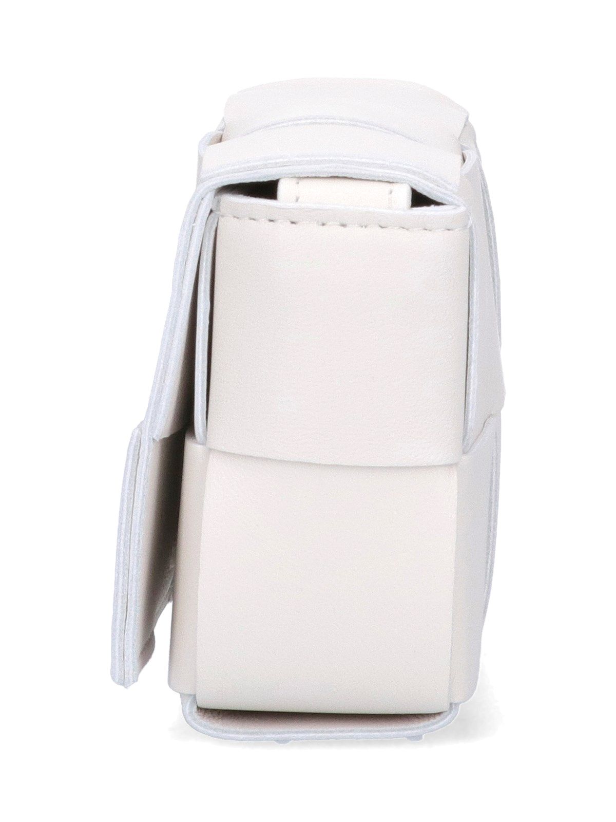 Borsa "Candy Cassette" Bottega Veneta, in pelle panna, motivo intrecciato, chiusura bottone magnetico, una tracolla regolabile, uno scomparto interno principale, uno slot carte interno.
