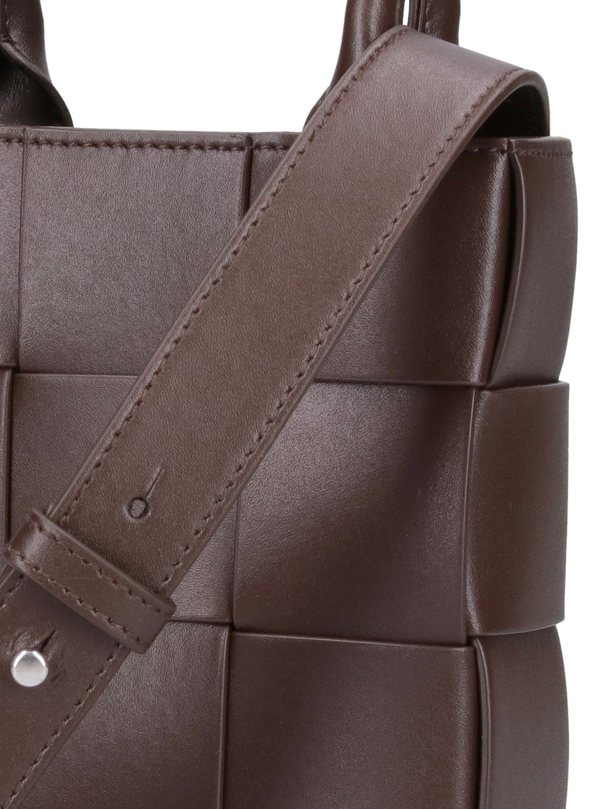 Borsa tote mini "Cassette" Bottega Veneta, in pelle marrone, motivo maxi intrecciato, due manici superiori, tracolla regolabile e rimovibile, uno scomparto interno principale.