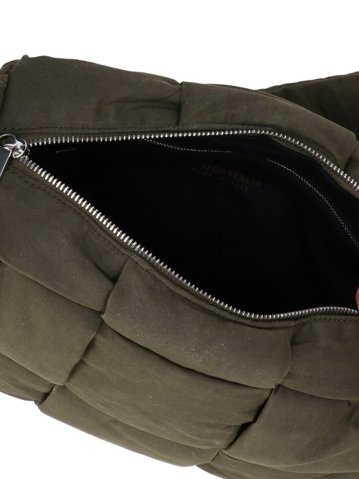 Borsa tracolla media "Arco" Bottega Veneta, in misto cotone verde, design imbottito, motivo Intreccio, tracolla regolabile, chiusura zip, una tasca piatta interna, una tasca zip interna, uno scomparto interno principale.
