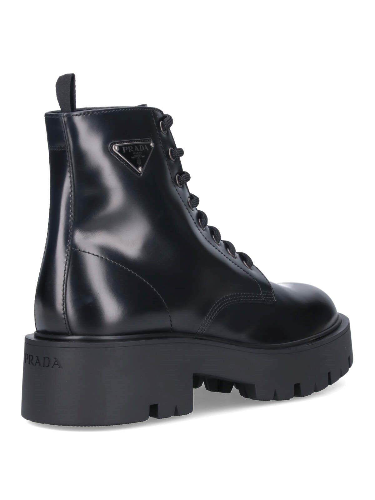 Stivaletti in pelle spazzolata prada, neri, punta tonda, chiusura lacci, dettaglio logo in metallo e smalto applicato laterale, linguetta retro, suola in gomma.