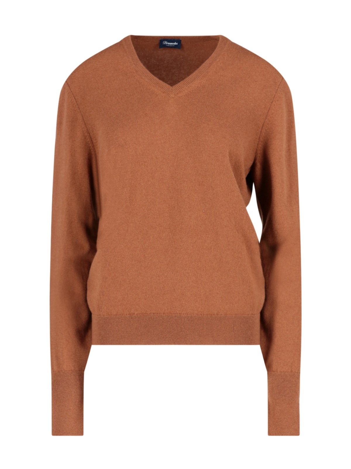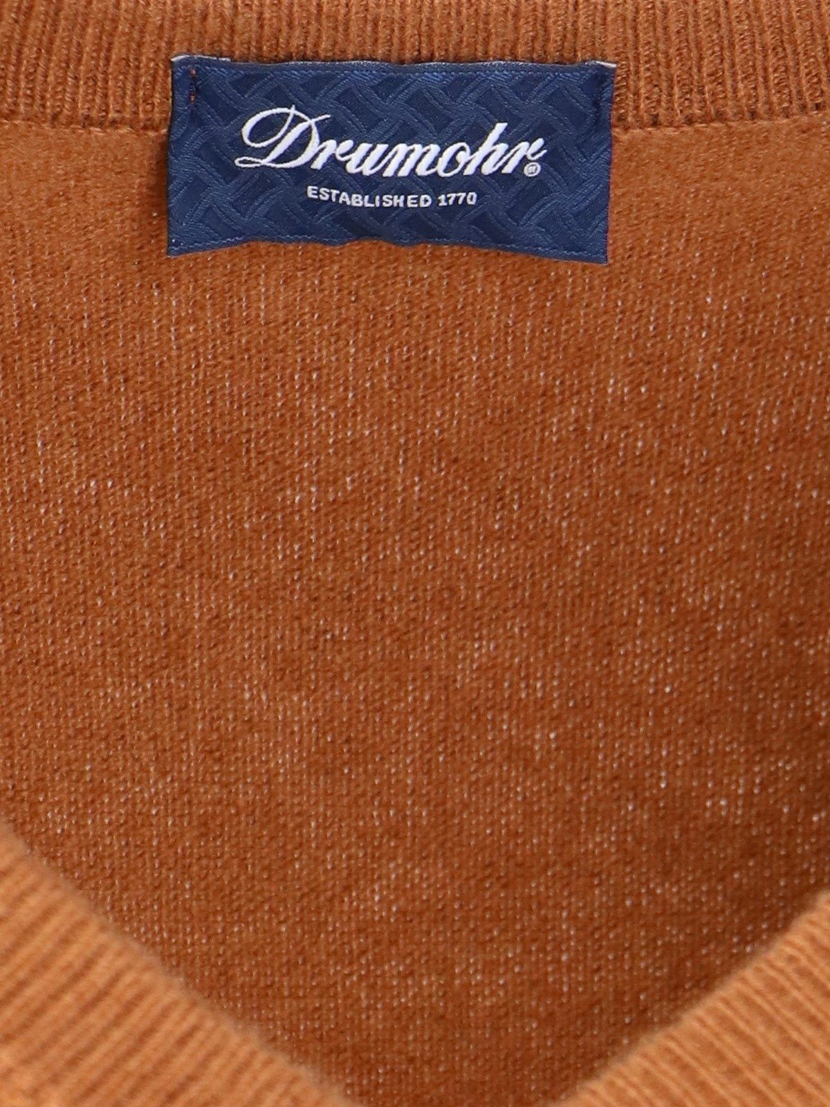 Maglione Scollo a V Drumohr, in cashmere beige, maxi polsini, finiture a costine, orlo dritto.