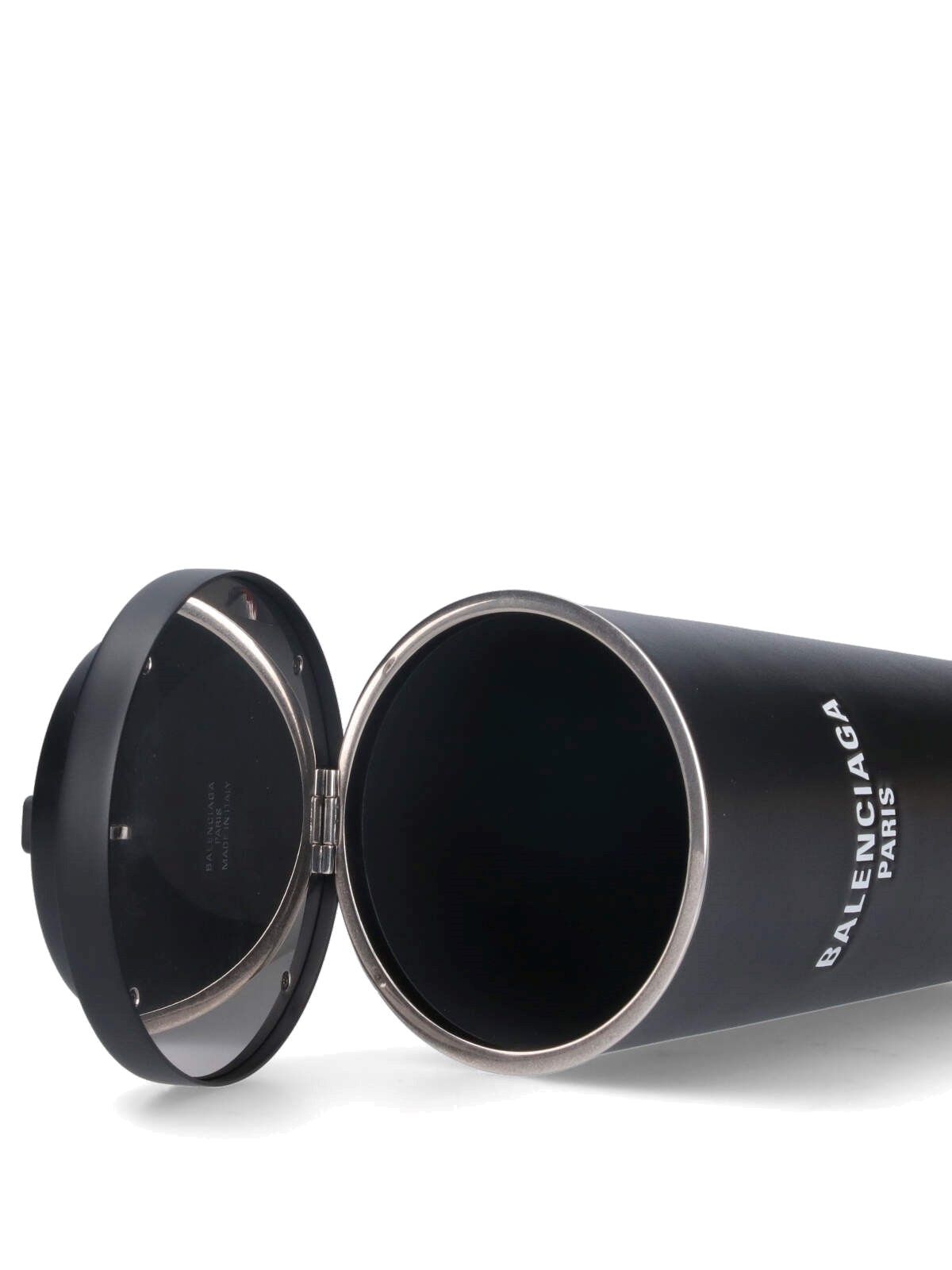 Clutch "9 Am" Balenciaga, in pelle nera, chiusura superiore, dettaglio logo, dettaglio logo a contrasto bianco fronte, scomparto interno unico.