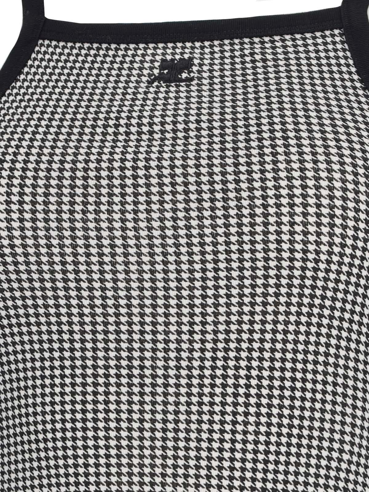 Abito mini pied de poule Courrèges, in cotone grigio, dettagli neri, smanicato, spalline sottili, logo ricamato fronte, orlo dritto.