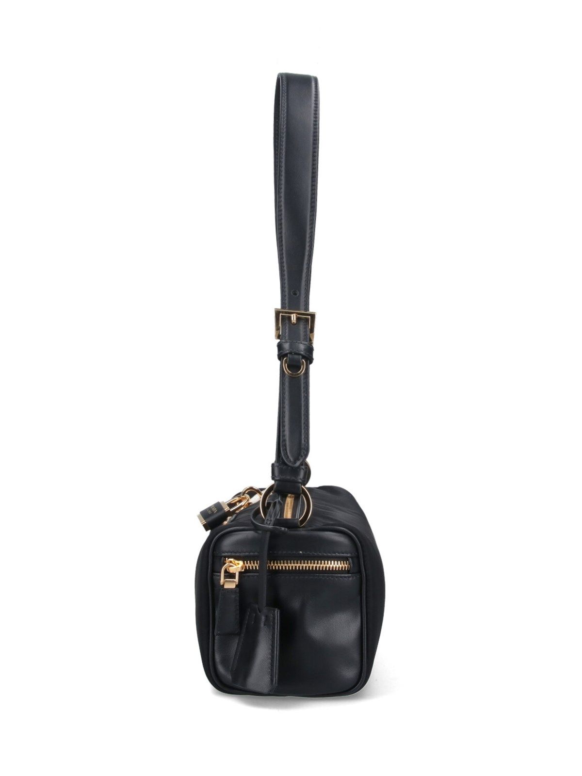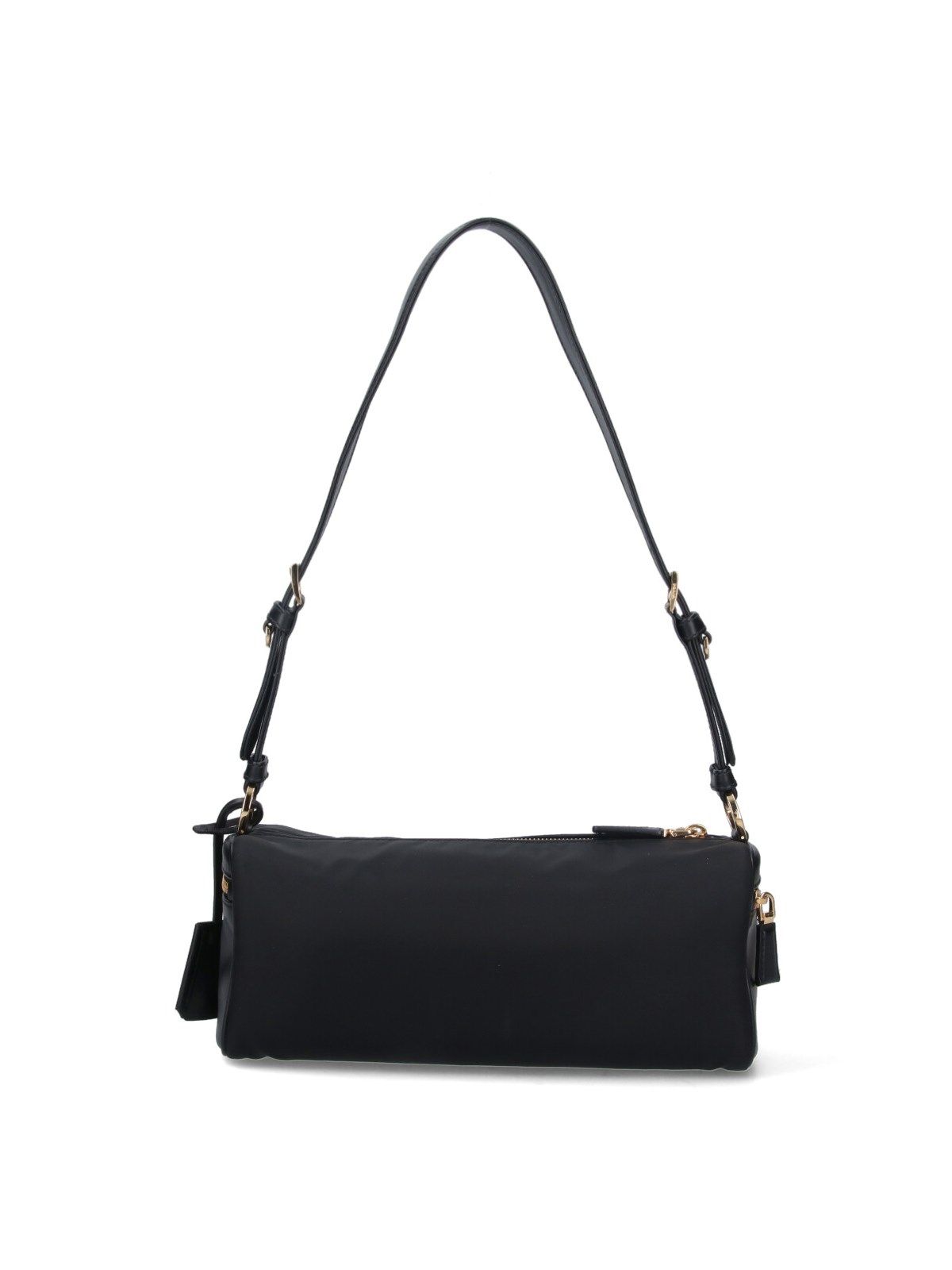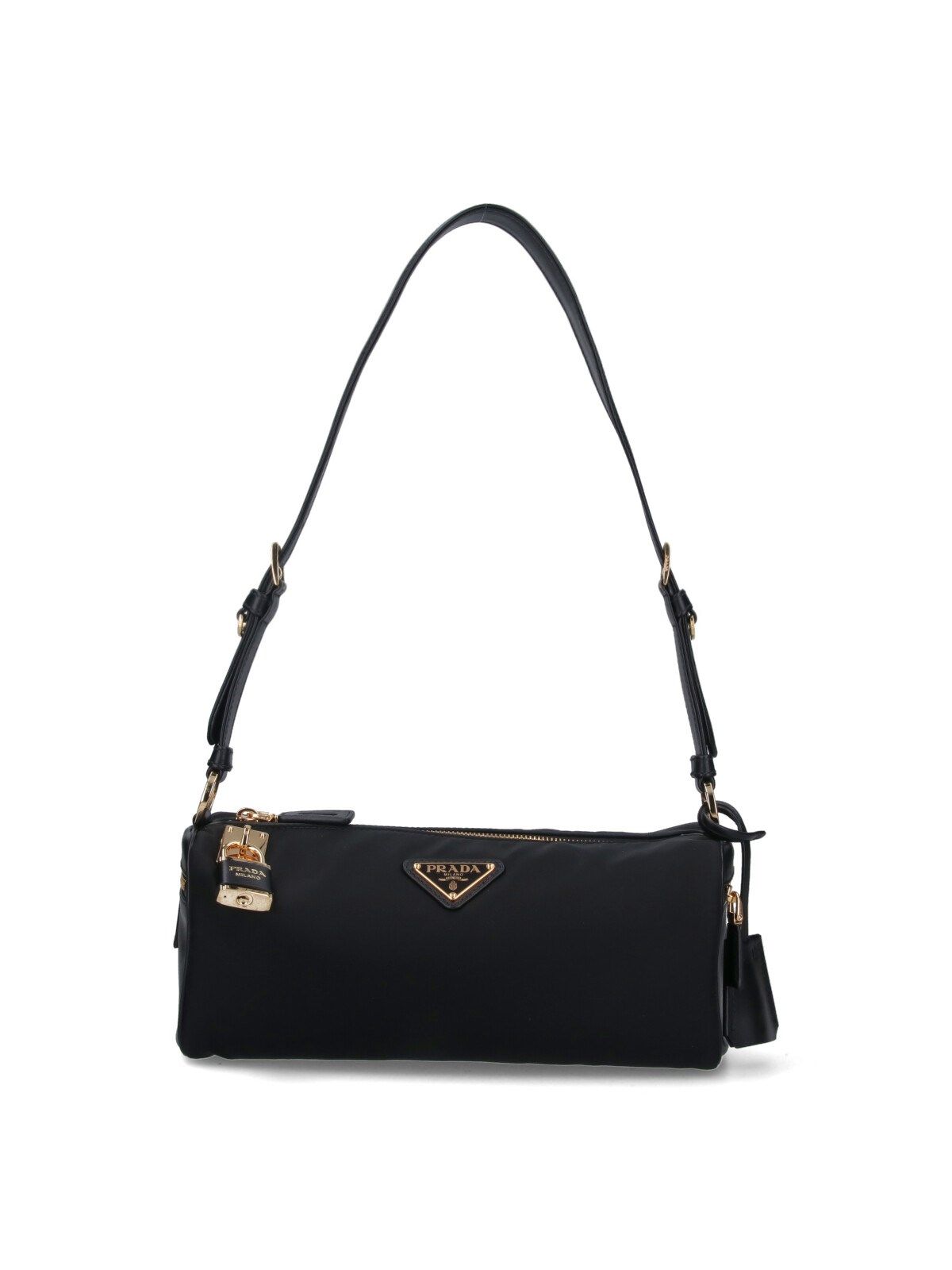 Borsa a spalla media logo Prada, in Re-Nylon nero, finiture in pelle, manico superiore regolabile, dettaglio portachiavi rimovibile ad anello in metallo dorato, charm lucchetto in metallo dorato fronte, logo triangolo in metallo smaltato dorato fronte, due tasche zip laterali, chiusura zip, una tasca zip interna, uno scomparto interno principale.