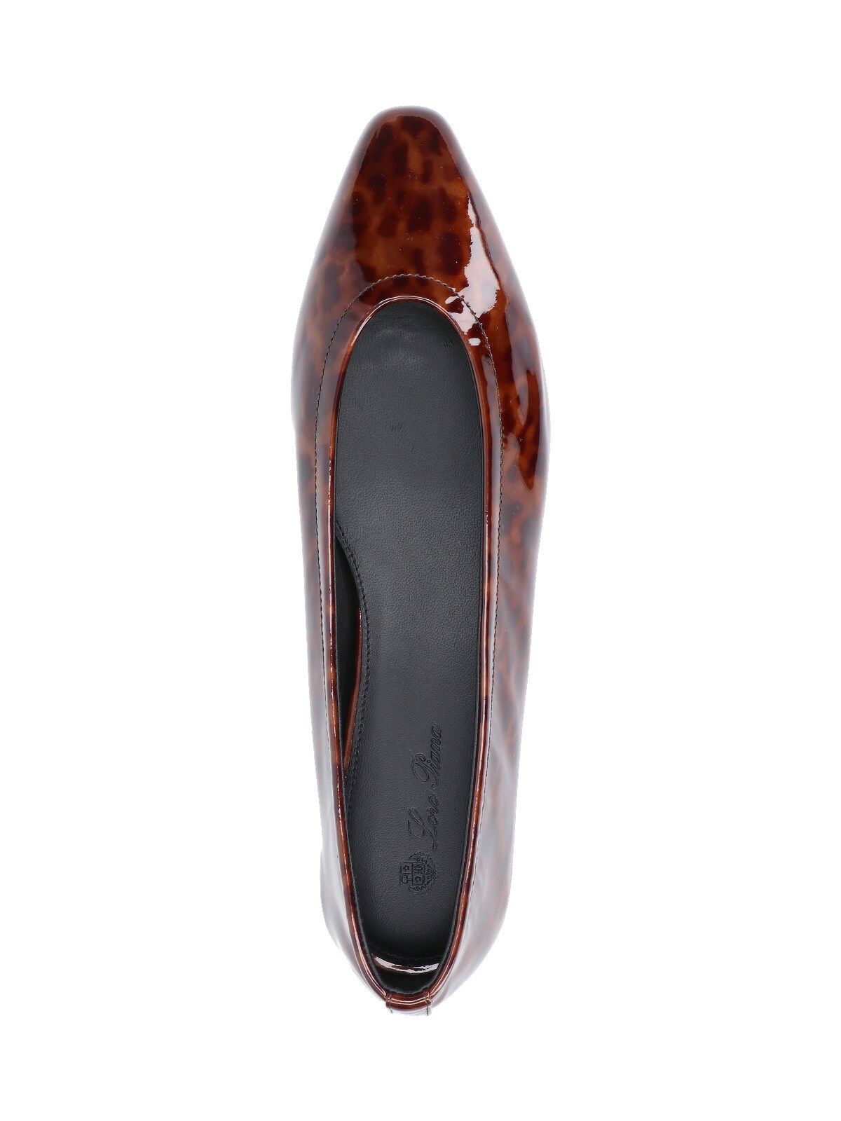 Ballerine animalier "Primula" Loro Piana, in vernice marrone, motivo stampa tartarugata, dettagli neri, a punta, vestibilità slip on, suola in pelle.