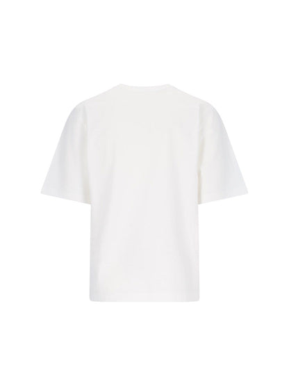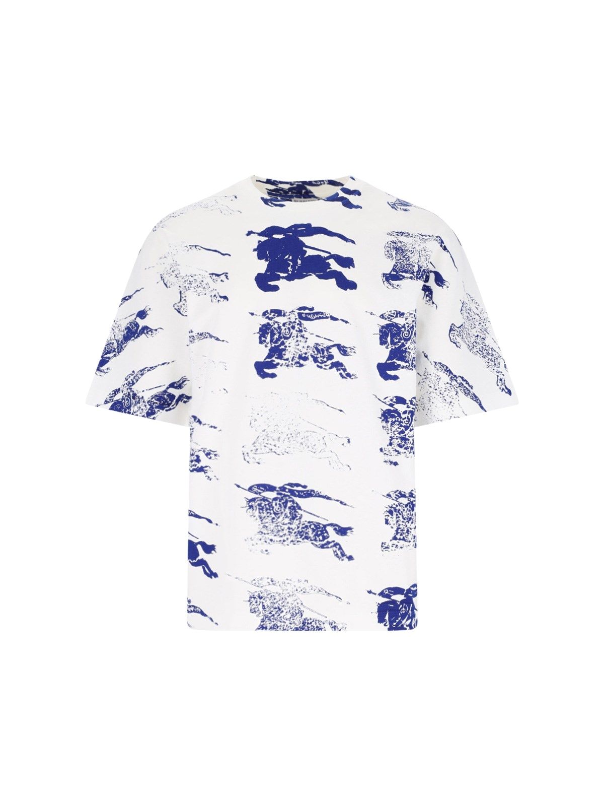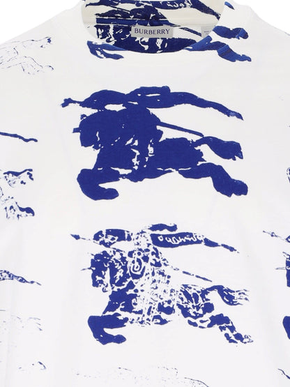 Burberry "Equestrian Knight" T-Shirt, in white cotton, crew neck, short sleeves, all-over blue print on the front, straight hem.