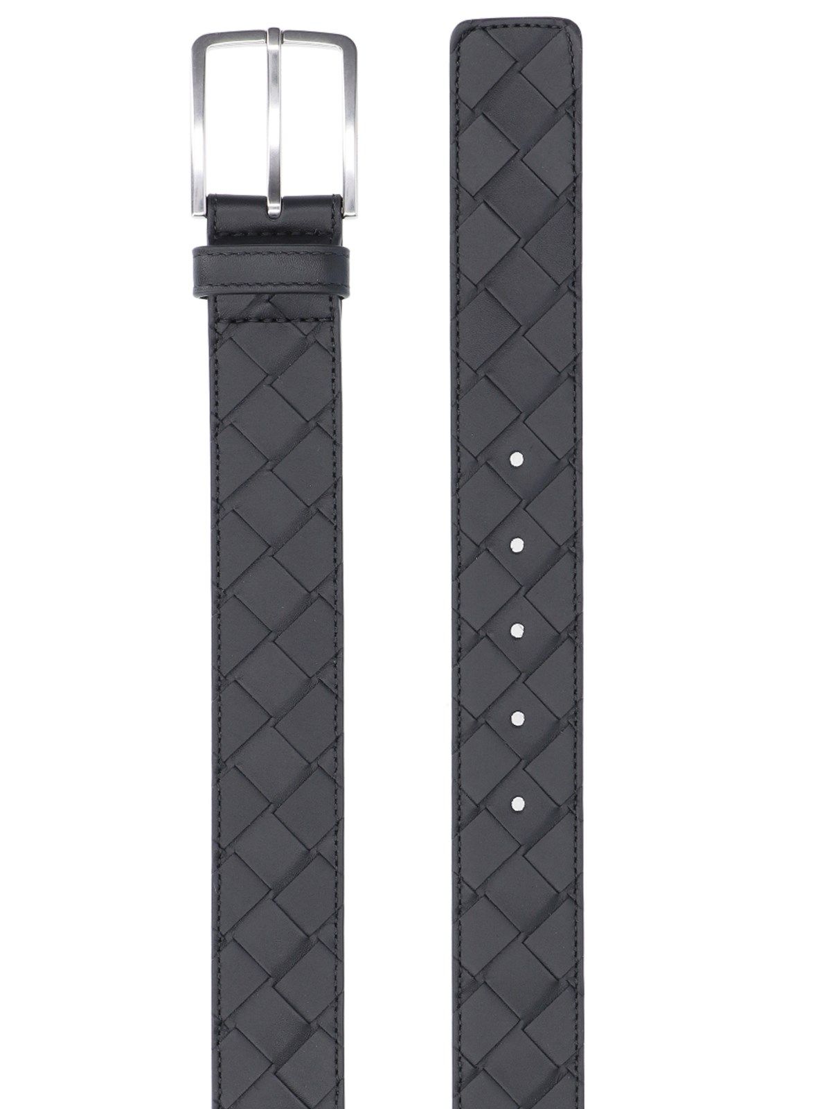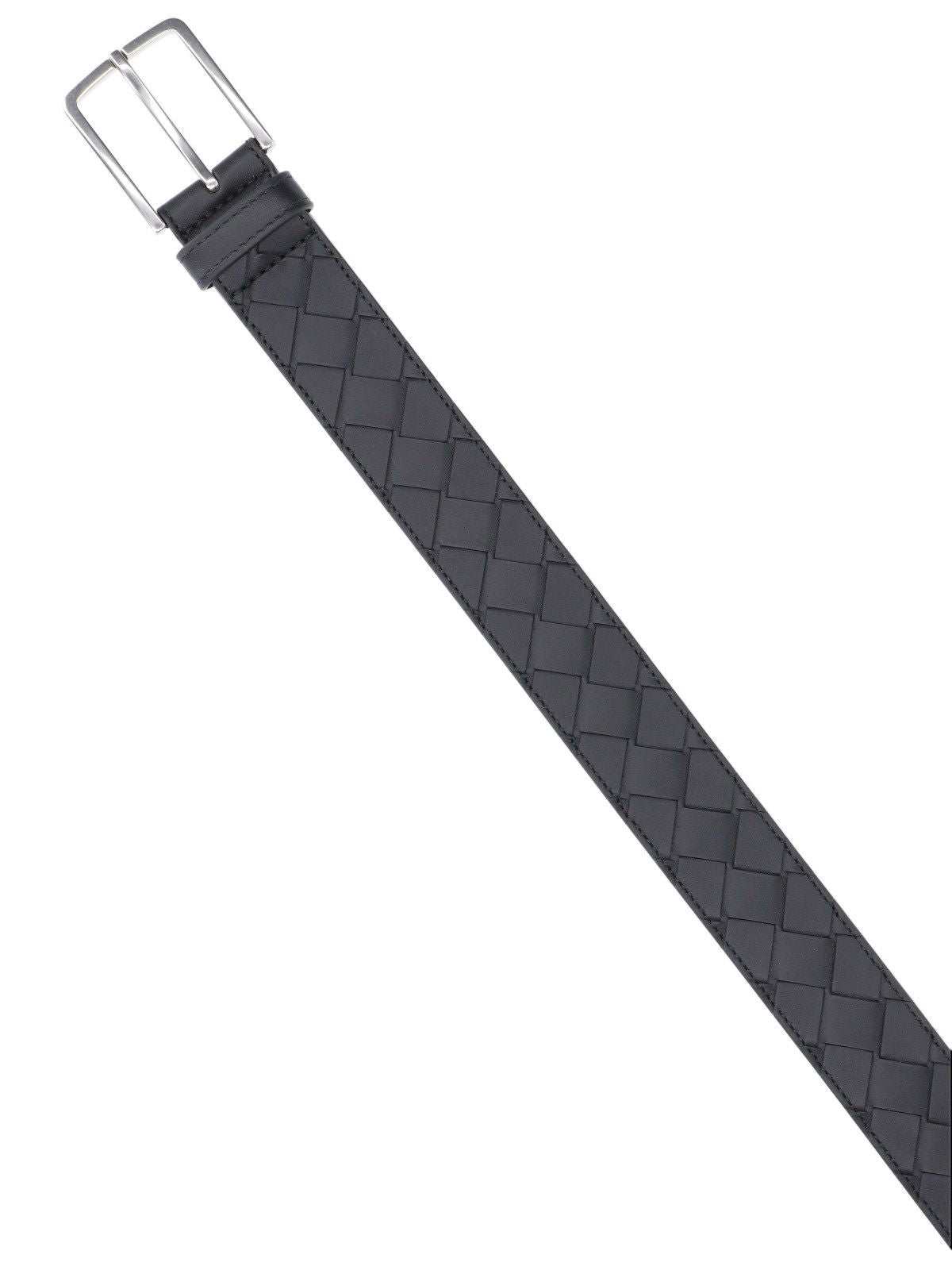 Cintura Intrecciato Bottega Veneta, in pelle nera, fibbia metallica argentata fronte, regolabile.
