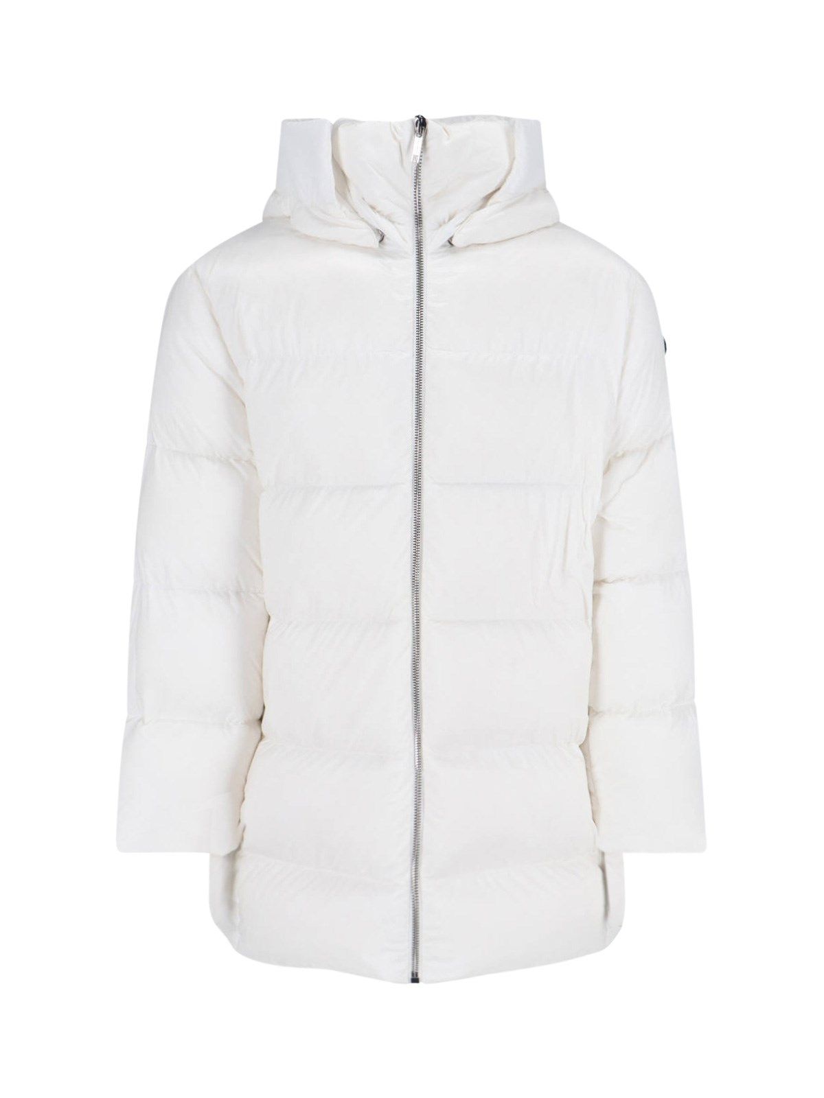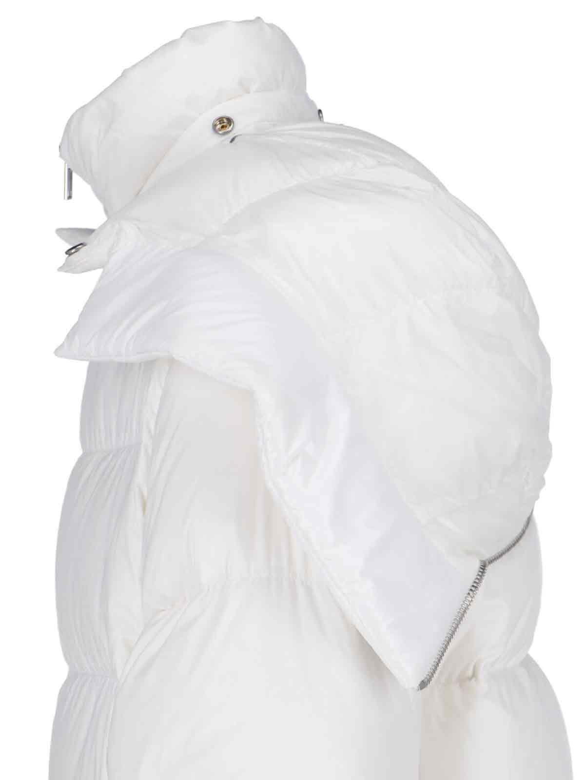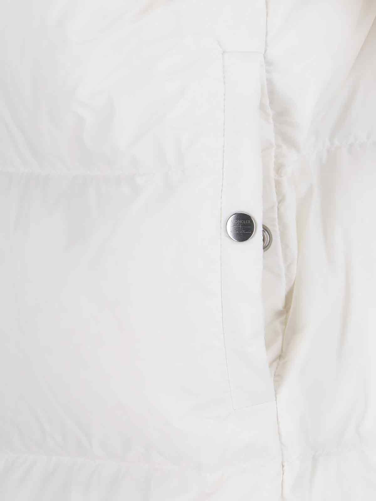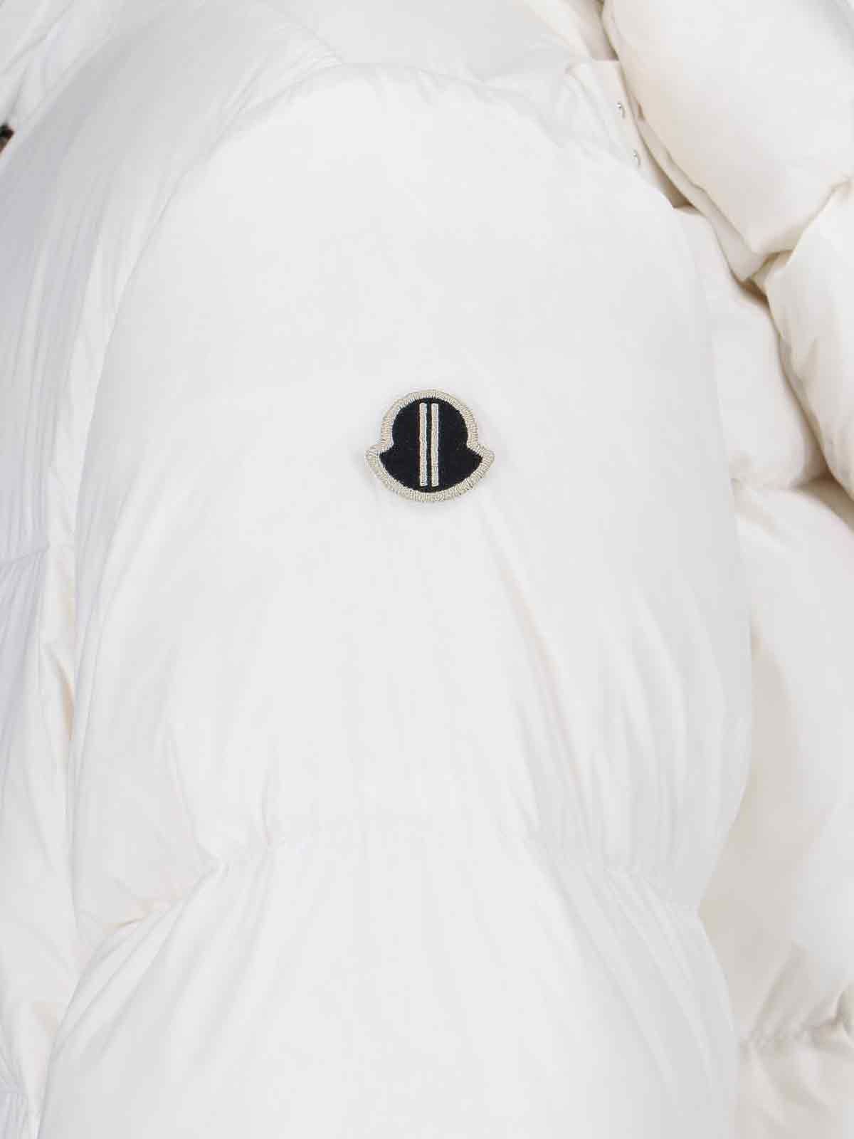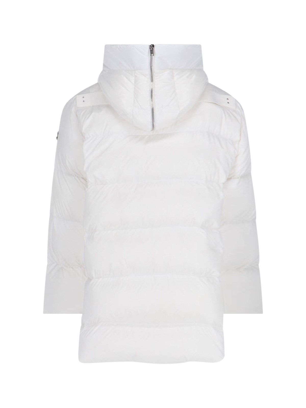 Piumino con cappuccio "Cyclopic" Moncler + Rick Owens, in tessuto bianco, design trapuntato ed imbottito, cappuccio coulisse, dettaglio regolabile con zip retro, a collo alto, chiusura zip, due tasche bottone laterali, patch logo manica, fascia decorativa tono su tono retro, dettagli elasticizzati su fondo, orlo dritto.