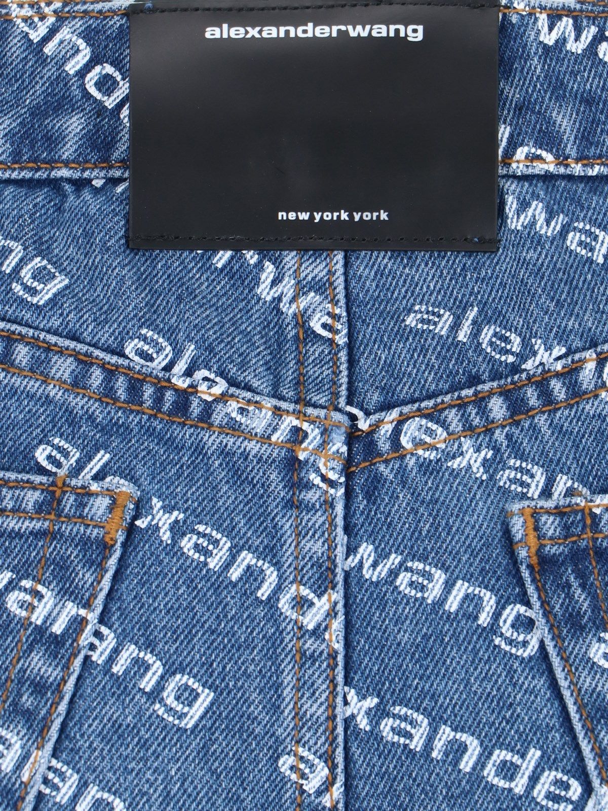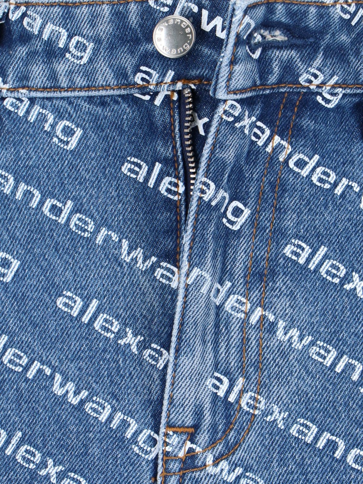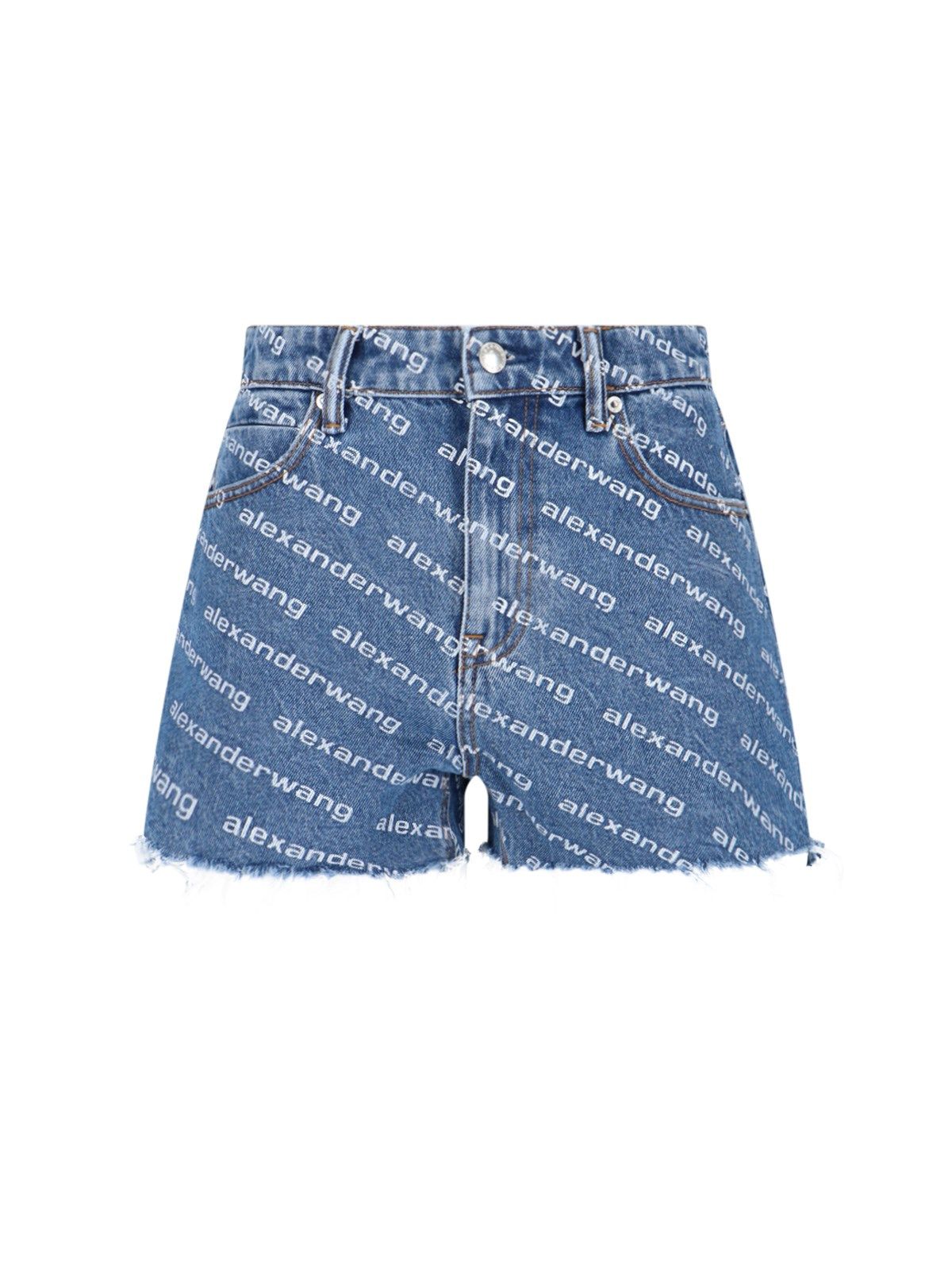 Pantaloncini logo Alexander Wang, in denim blu, lavaggio usured, motivo stampa logo bianca all-over, a vita media, passanti cintura, chiusura zip e bottone, design cinque tasche, patch logo tono su tono retro, dettagli destroyed su fondo.