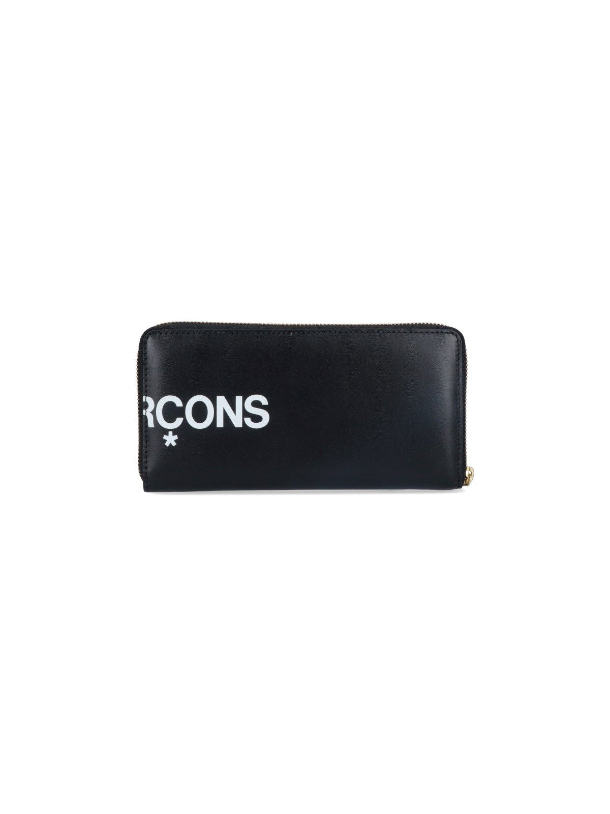 Comme des Garcons Wallet logo zip wallet, in black leather, white logo print on front and back, zip closure, six internal card slots, two internal flat pockets, one internal coin pocket, embossed gold logo inside.