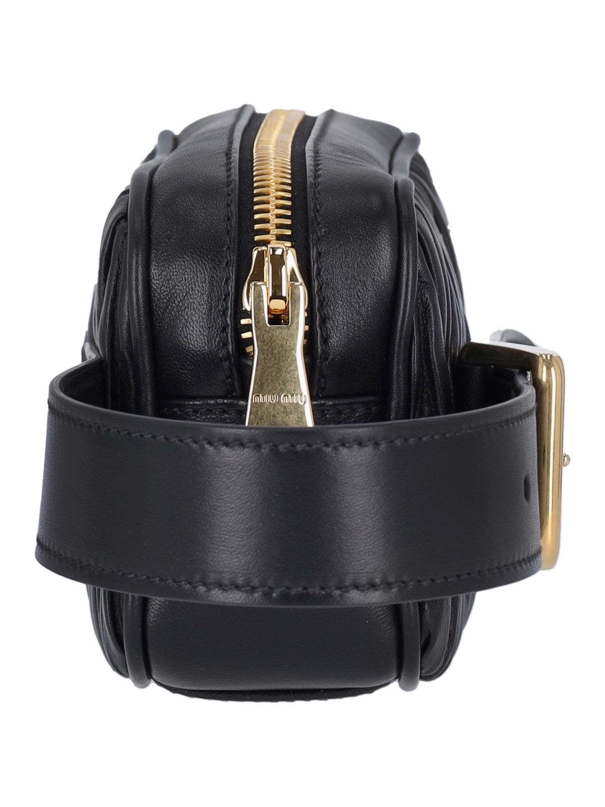 Puoch matelassé logo Miu Miu, in pelle nera, un manico laterale regolabile, chiusura zip, logo metallico dorato fronte, una tasca zip interna, uno scomparto interno principale.