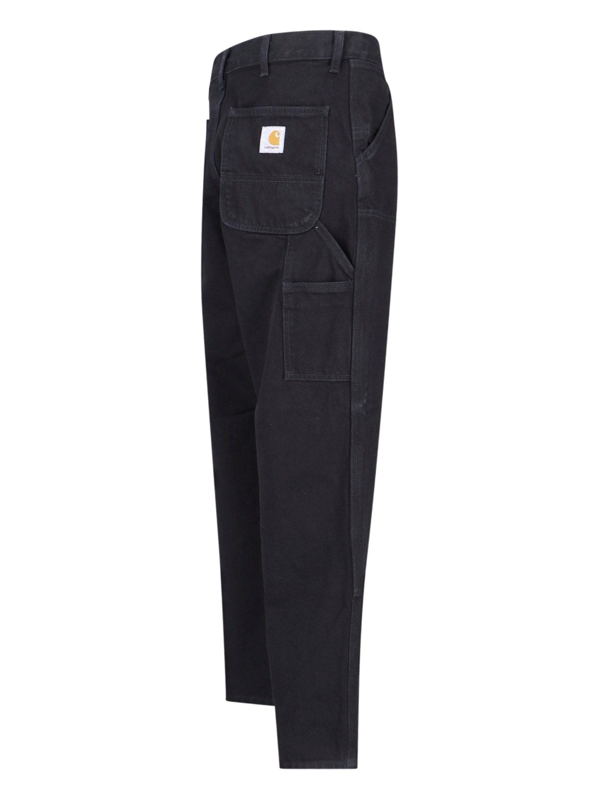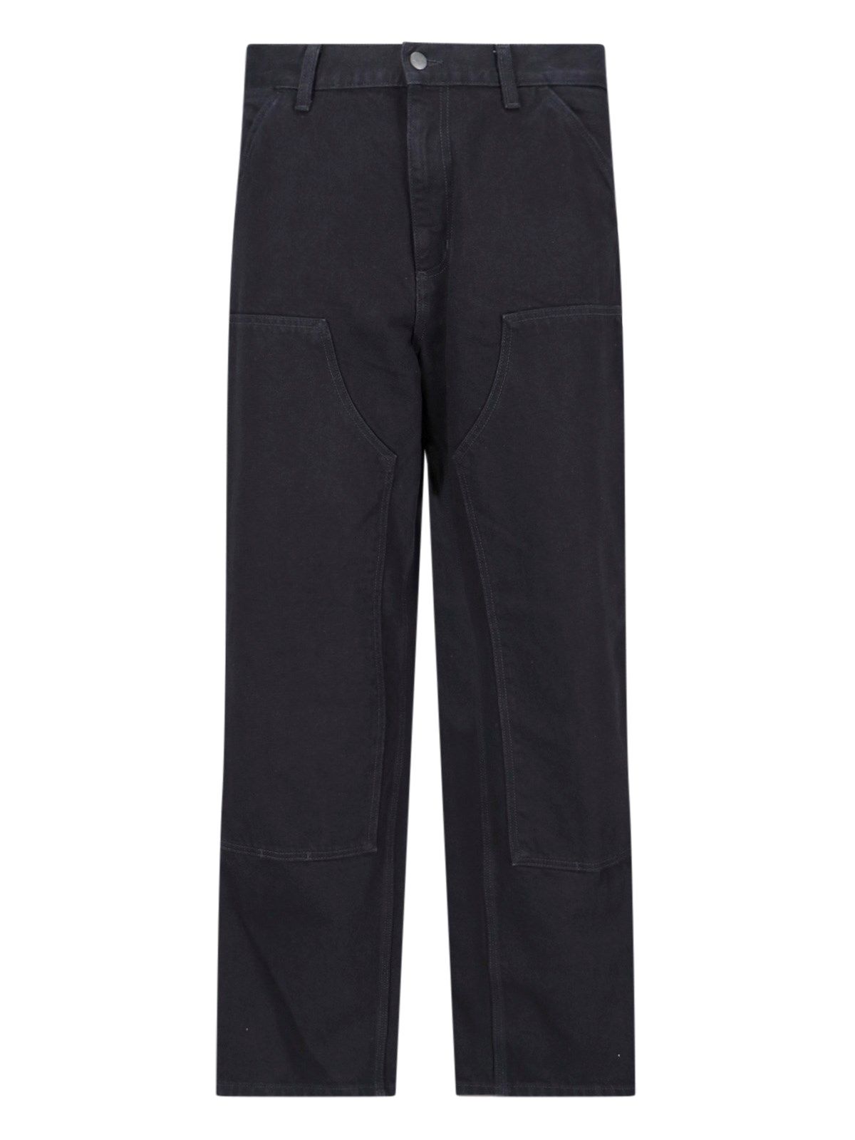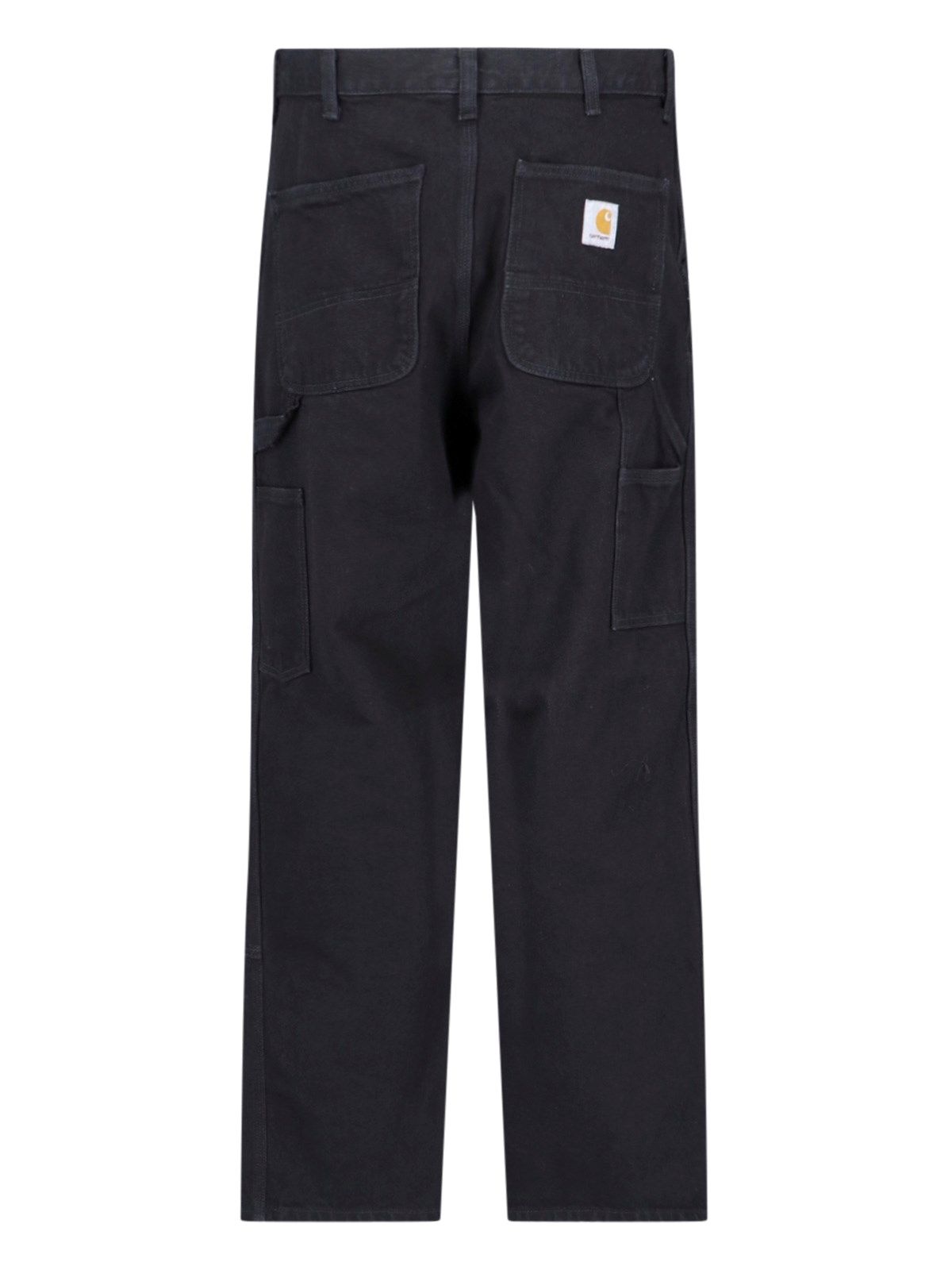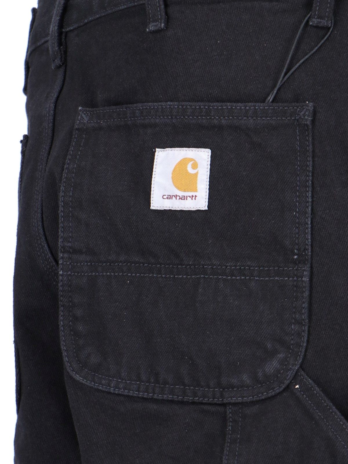 Jeans carpenter "Double Knee" Carhartt WIP, in denim nero, lavaggio usured, passanti cintura, chiusura bottone e zip, pannelli applicati fronte, due tasche piatte laterali, passante per martello e tasca attrezzi laterale, varie tasche piatte retro, etichetta logo dorata retro, gamba dritta.