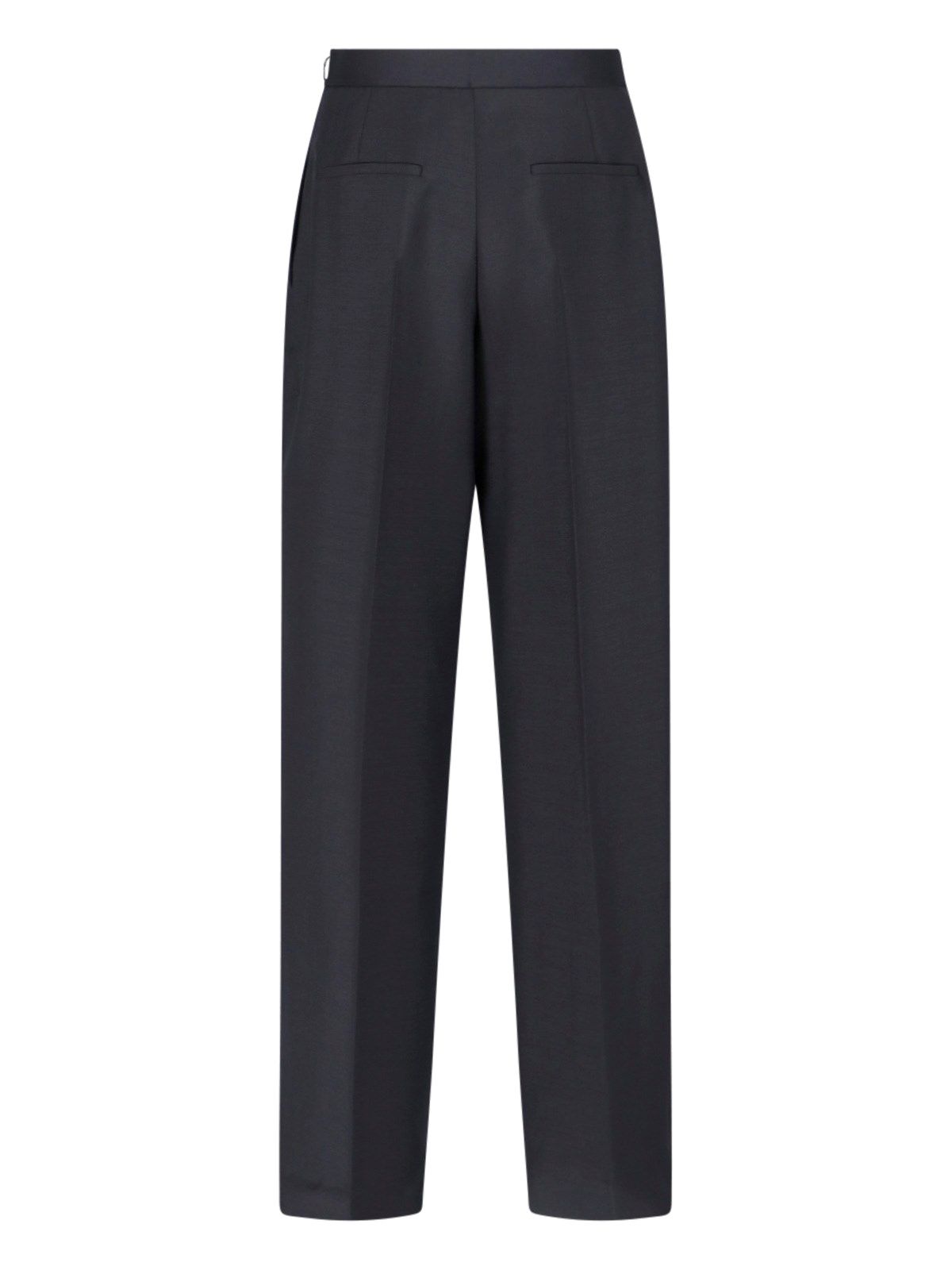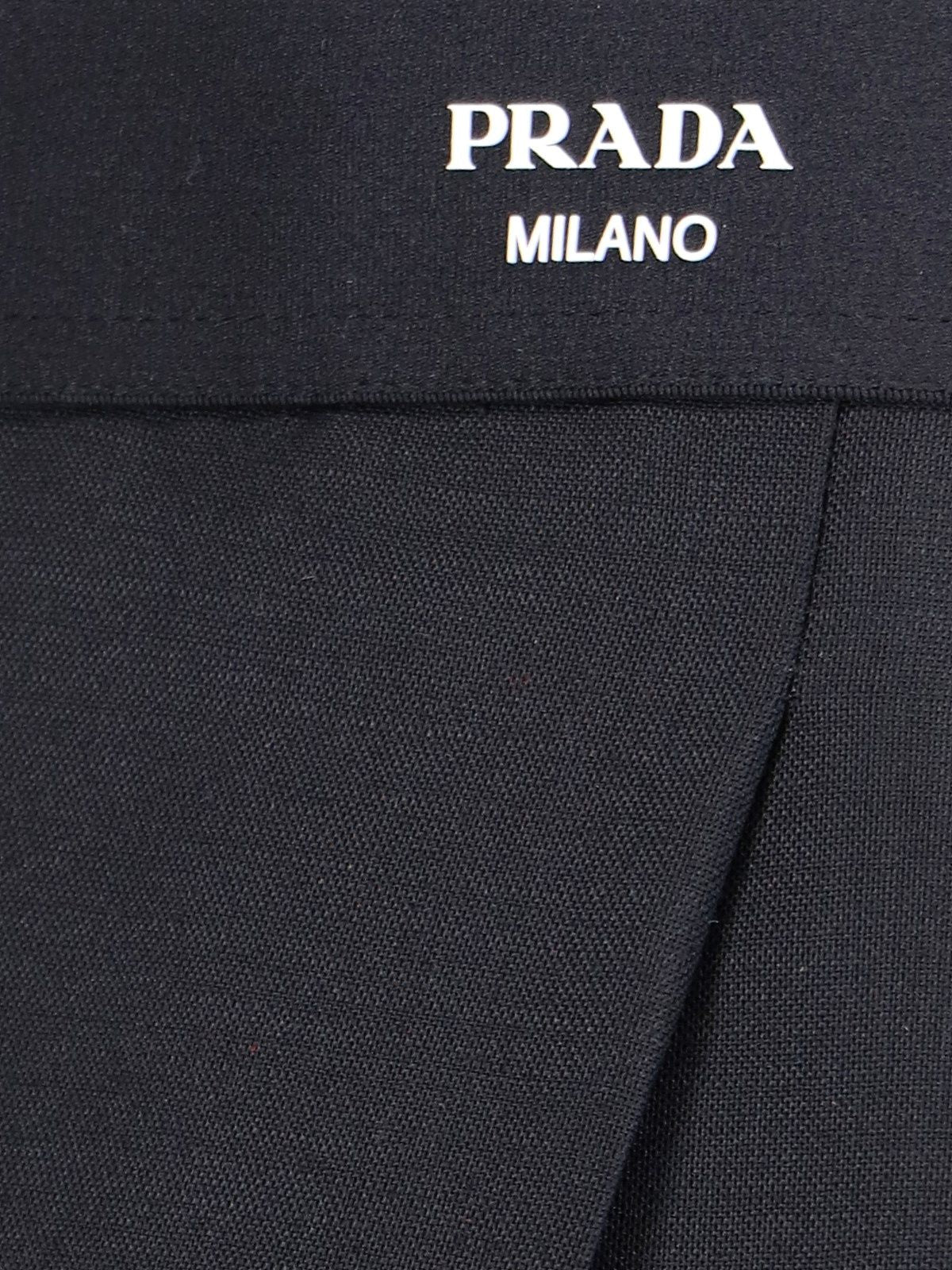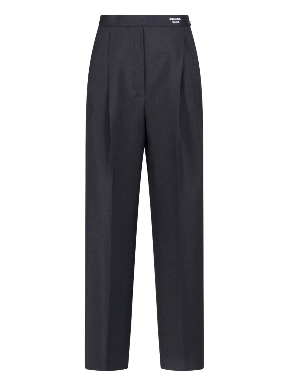Pantaloni Sartoriali logo Prada, in lana e mohair nero, logo bianco fronte, pinces centrali, due tasche laterali, chiusura zip laterale, orlo dritto.