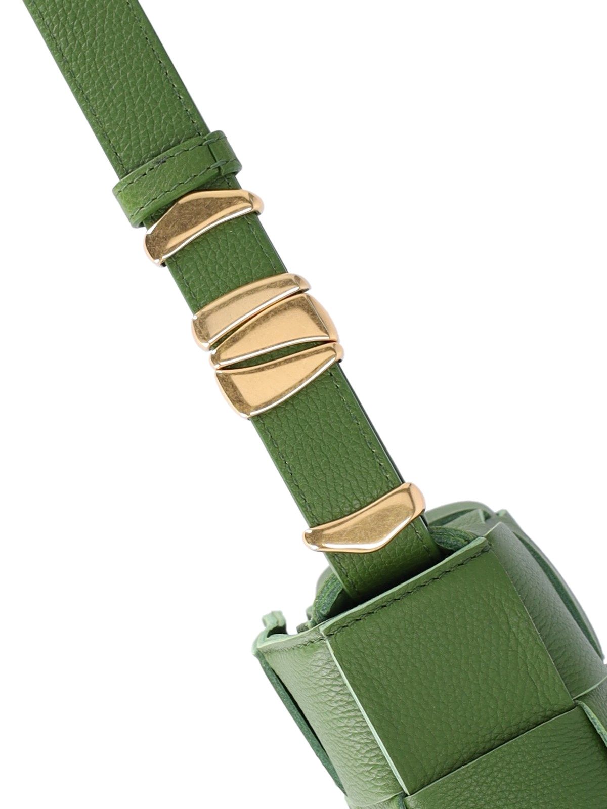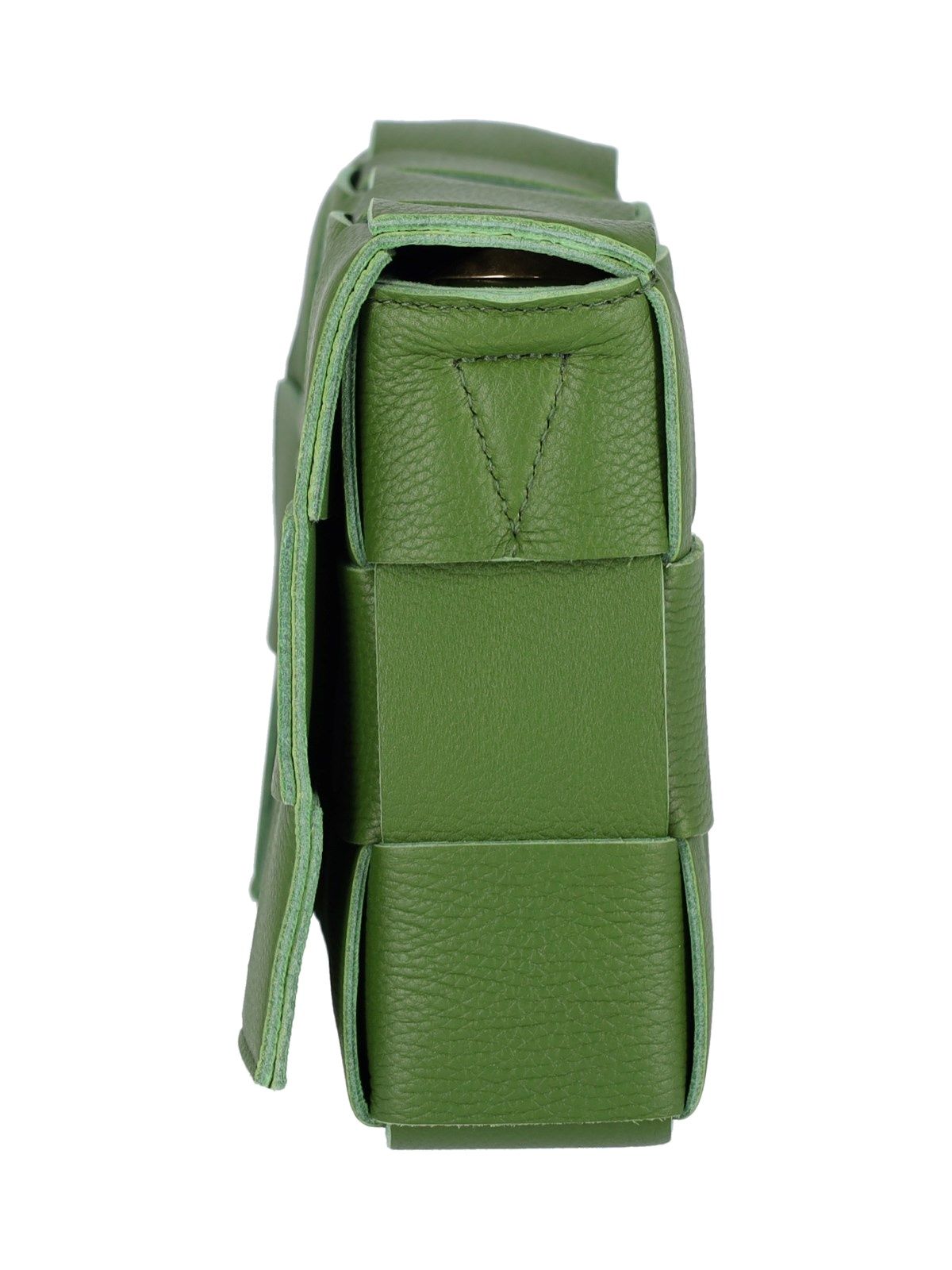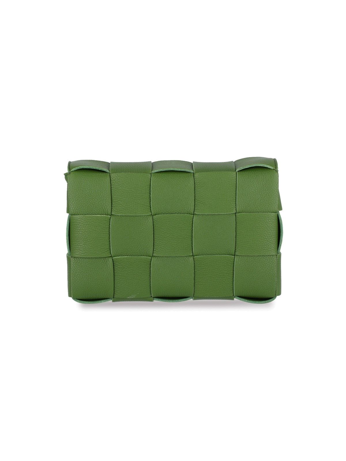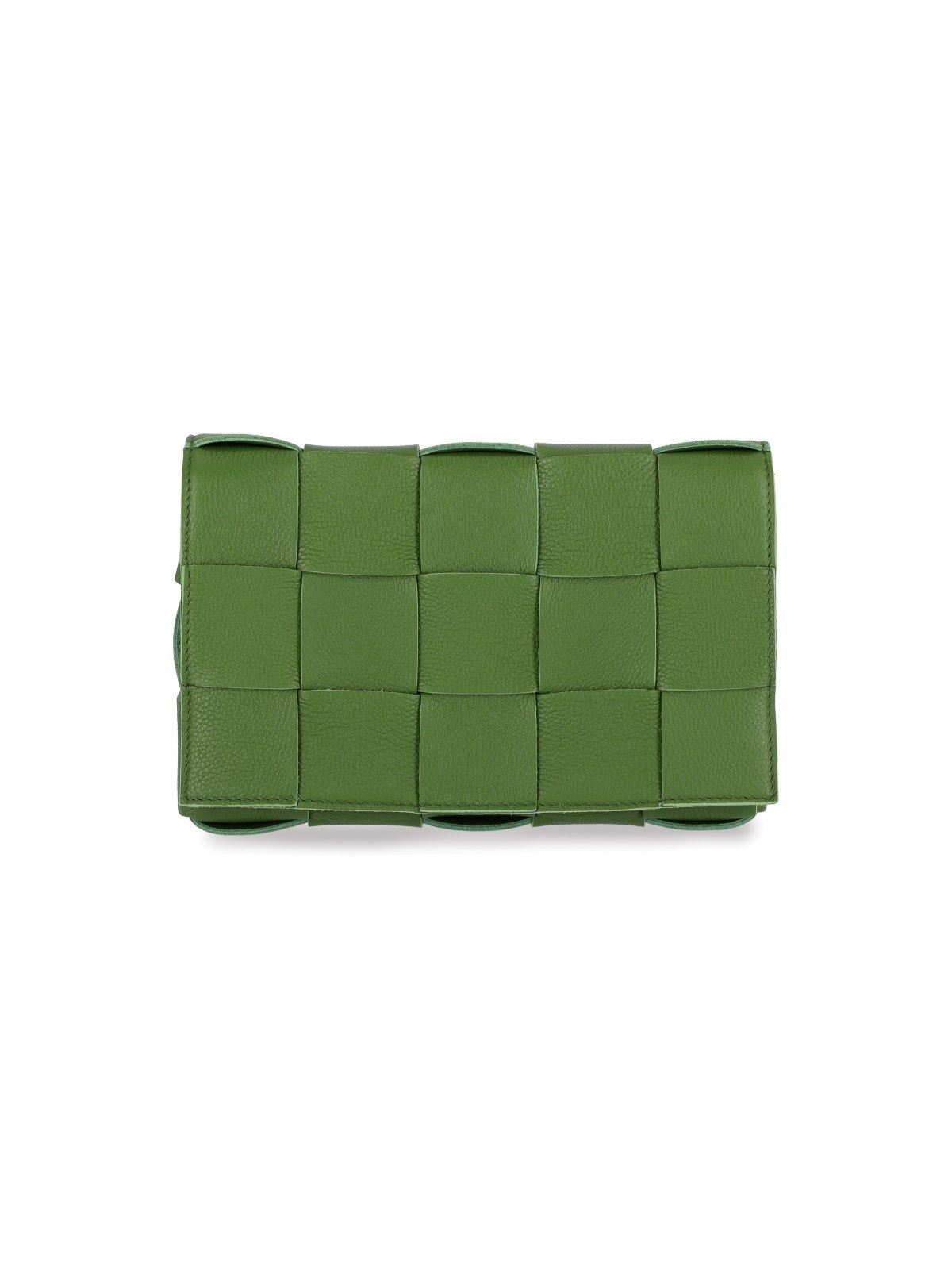 Borsa A Tracolla "Cassette" Bottega Veneta, in pelle martellata verde, motivo intrecciato, tracolla regolabile, dettagli metallici dorati tracolla, chiusura bottoni magnetici, uno scomparto interno principale.