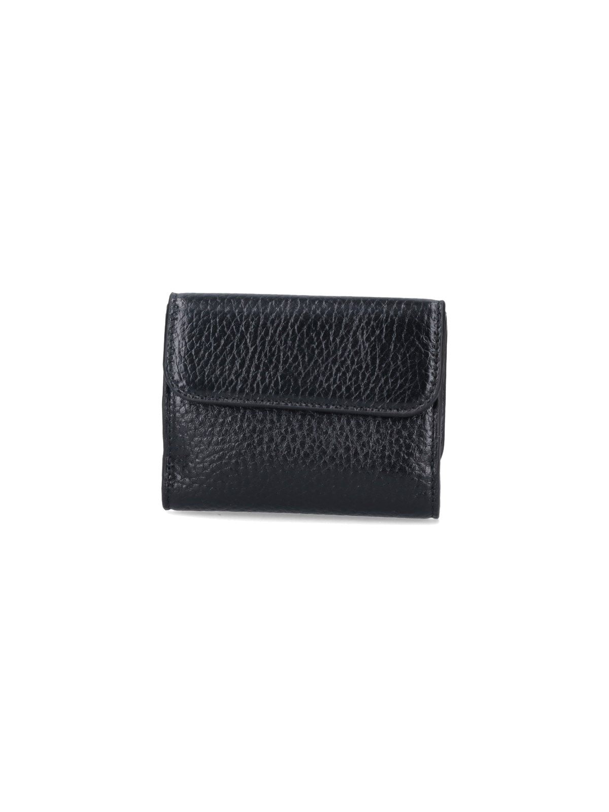 Portafoglio tri-fold logo Chloe, in pelle martellata nera, logo goffrato tono su tono fronte, chiusura bottone a pressione, una tasca patta retro, uno scomparto banconote interno, quattro slot carte interni, una tasca piatta interna.