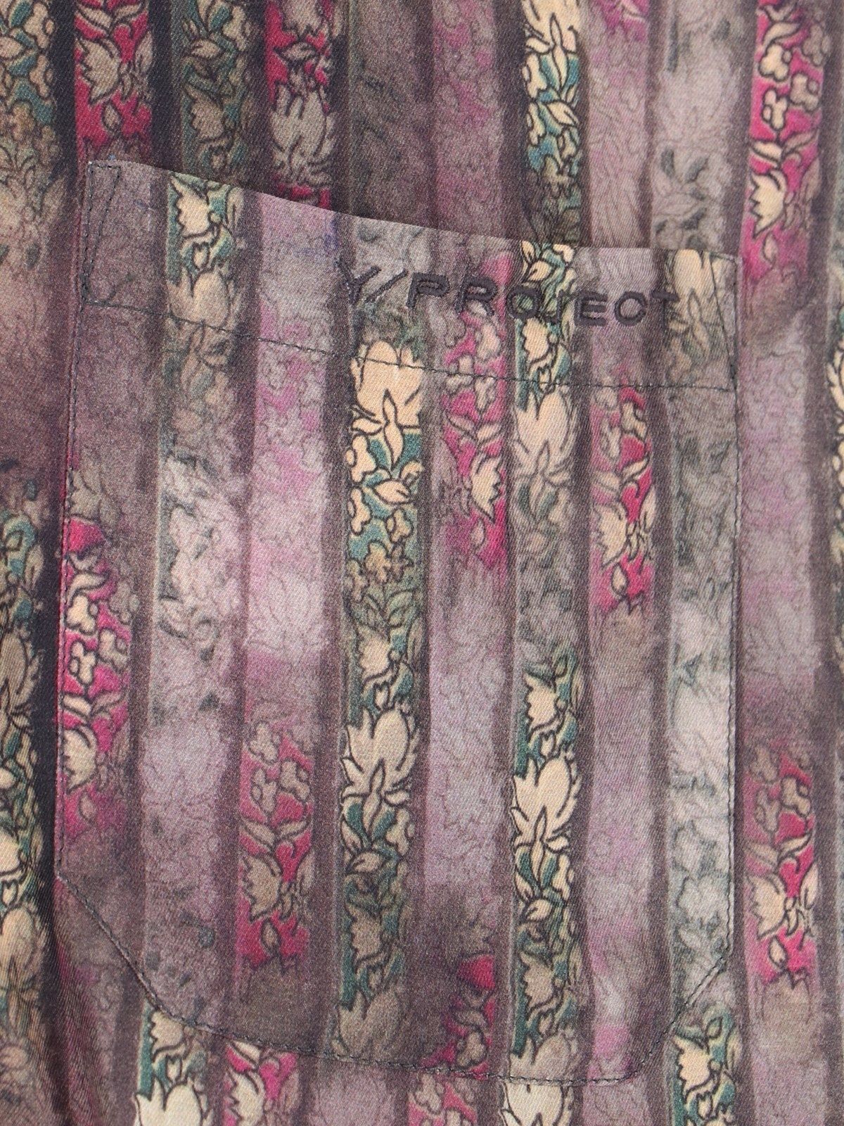 Camicia motivo floreale Y Project, in viscosa marrone, motivo stampa floreale, dettagli multicolor, colletto classico, chiusura bottoni, bottoni polsini, taschino petto, dettaglio ricamo logo nero, orlo curvo