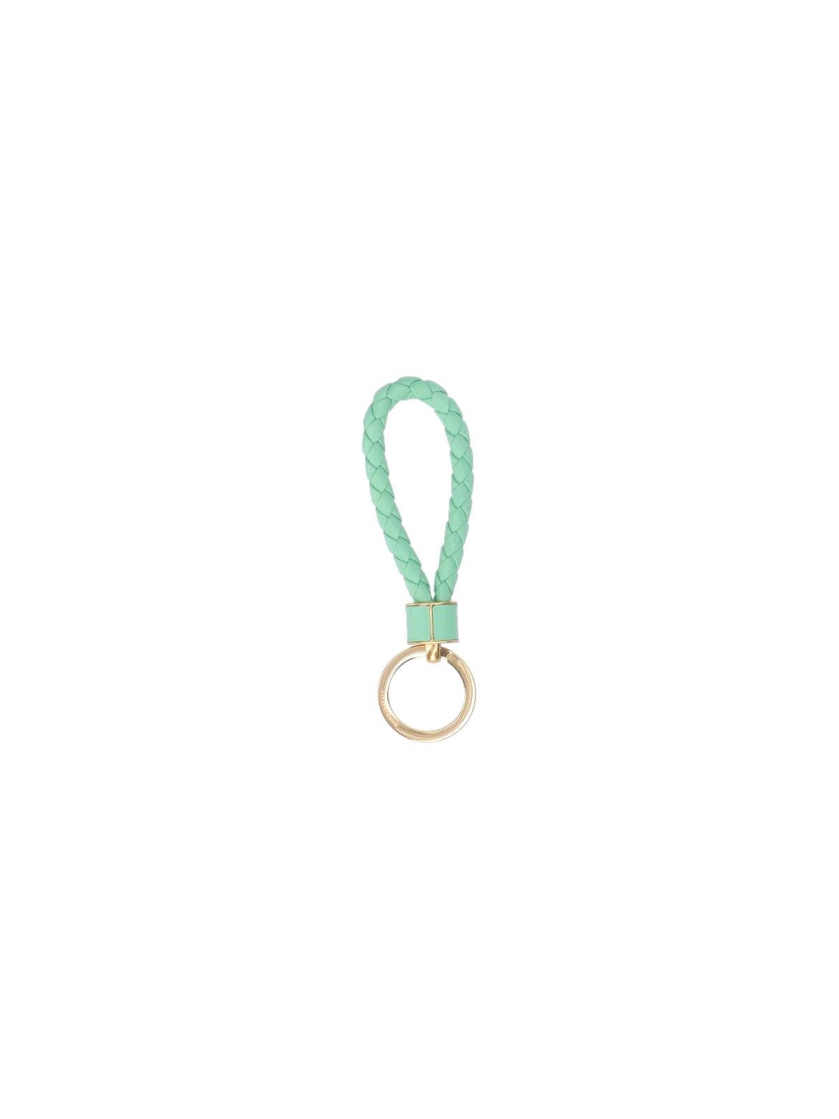 Portachiavi "Intreccio" Bottega Veneta, in pelle verde, motivo iconico intrecciato, anello metallico dorato, logo inciso.