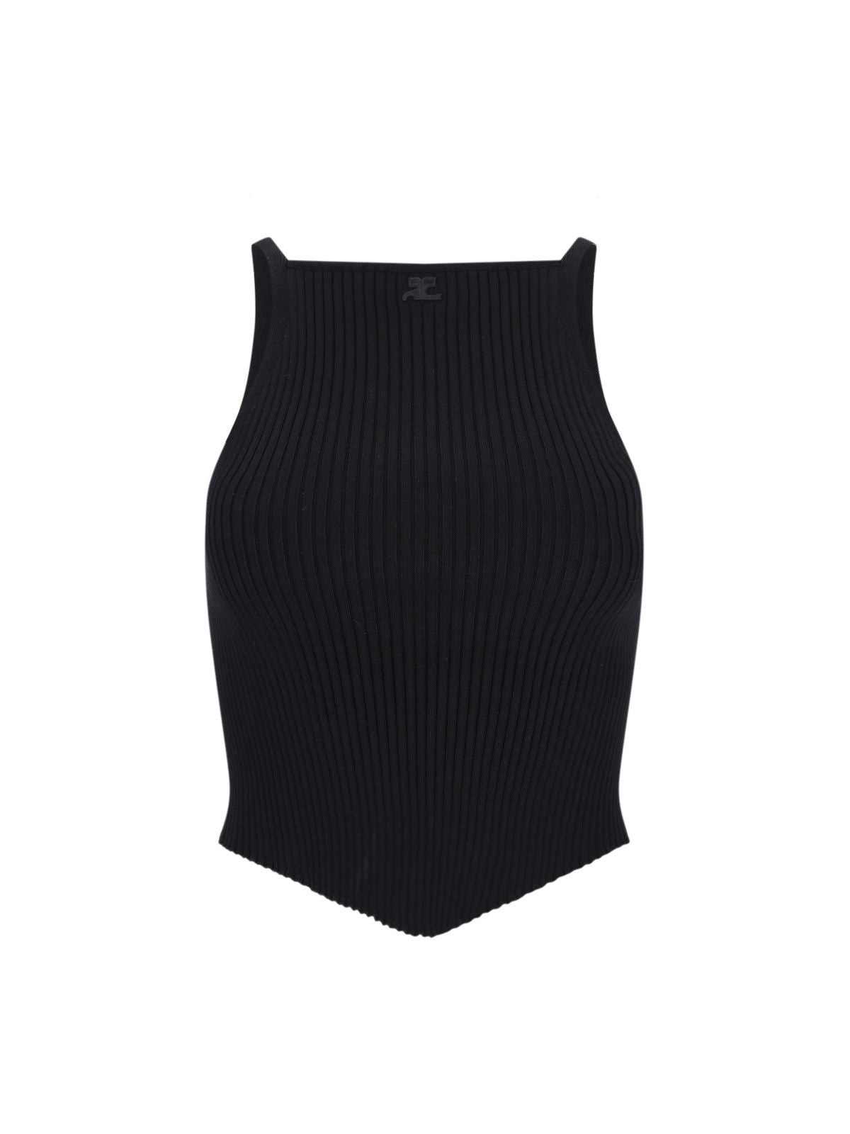 Top in maglia Courregès, in tessuto nero, dettagli tono su tono, scollo squadrato, spalline sottili, smanicato, patch logo petto, orlo più corto retro.
