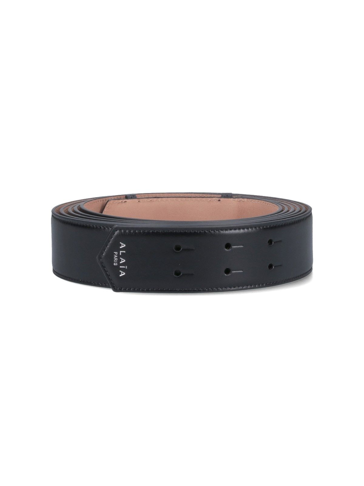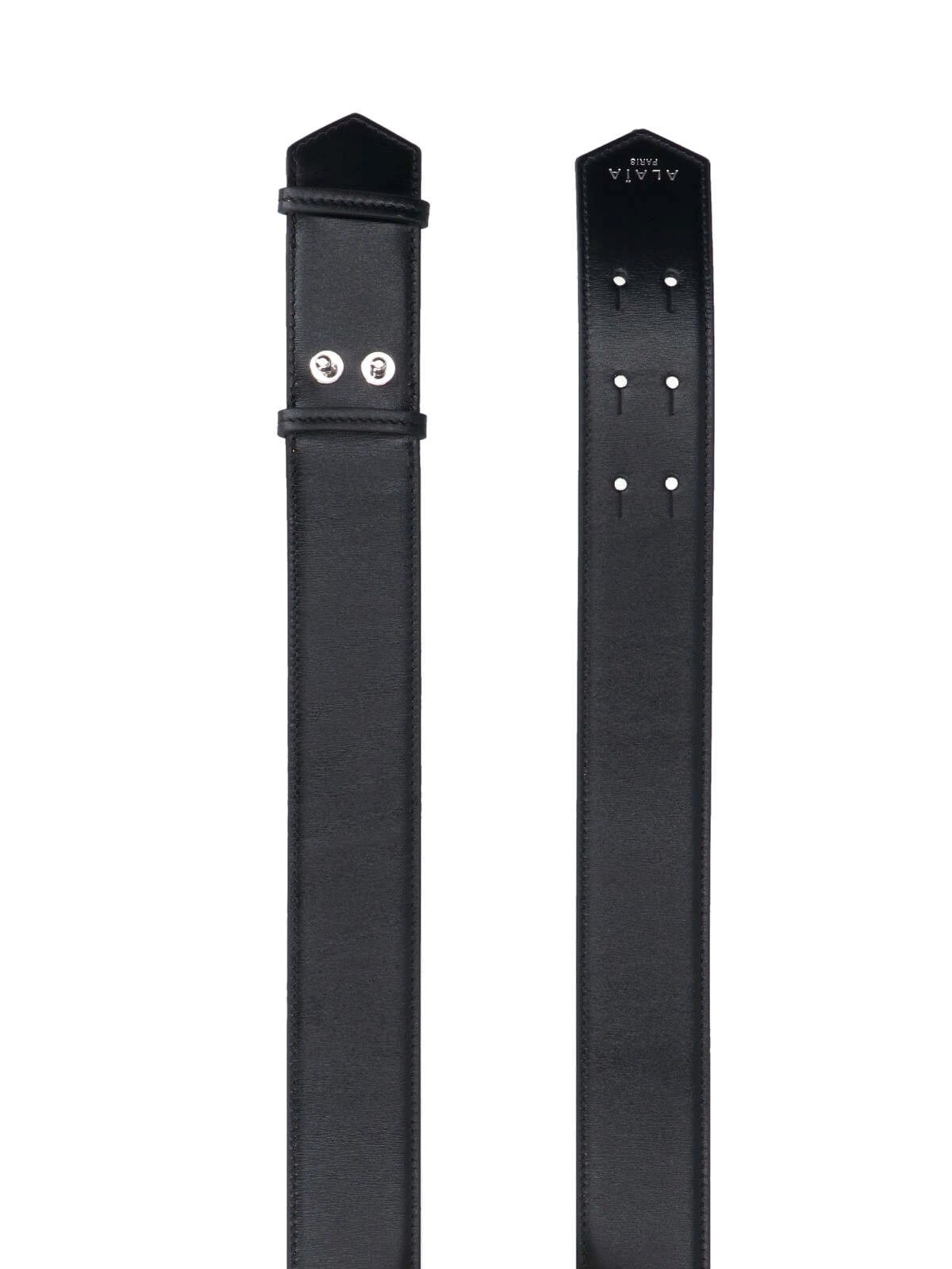 Cintura "One Piece" Alaïa, in pelle nera, stampa logo argentato, passanti, chiusura bottoni.