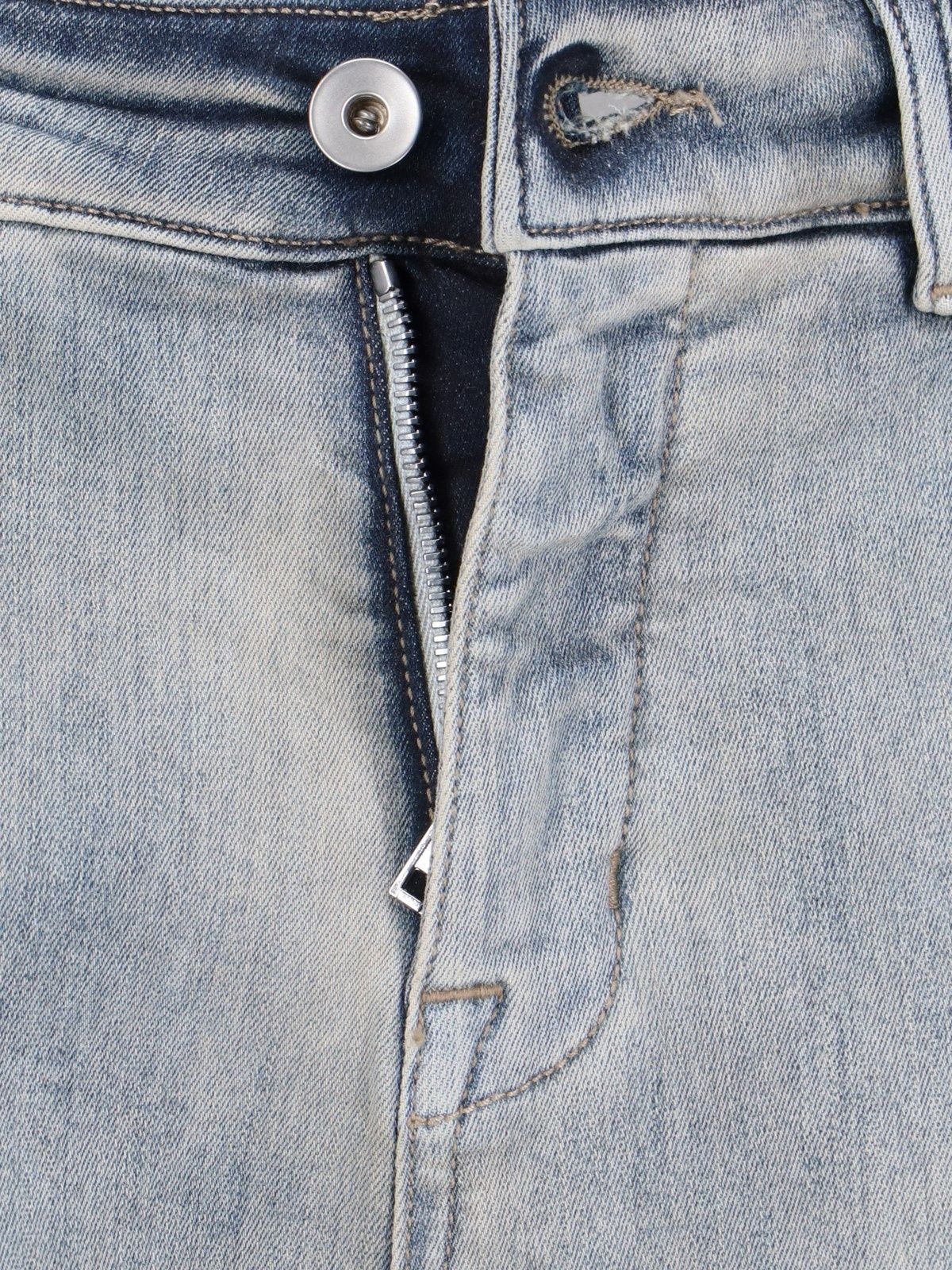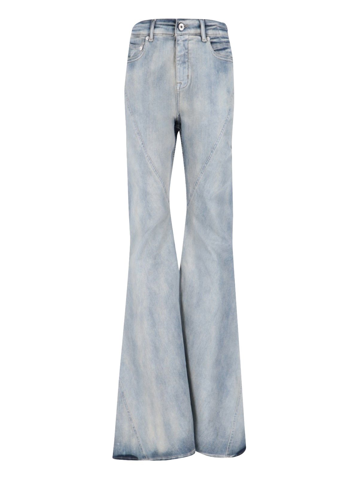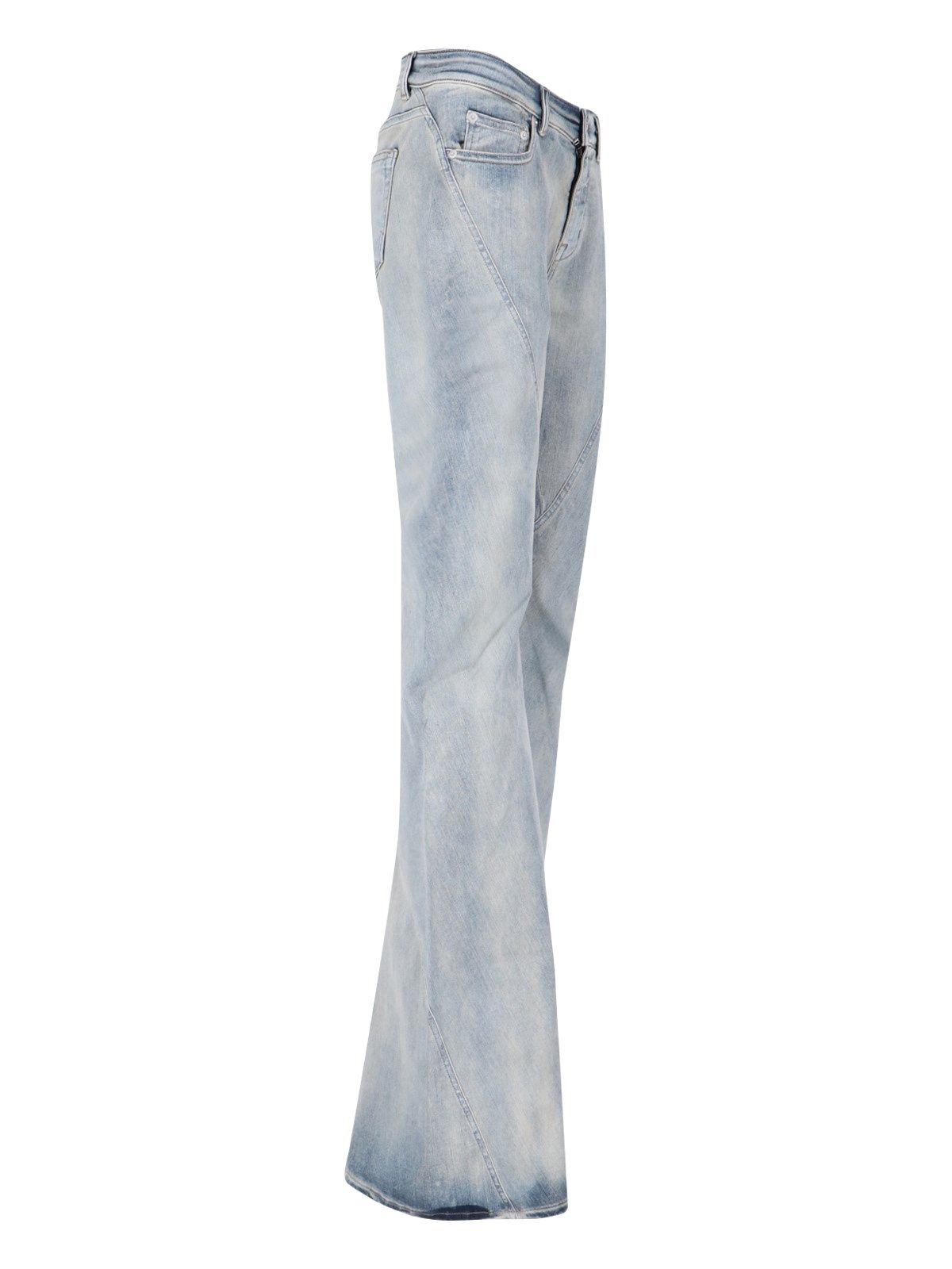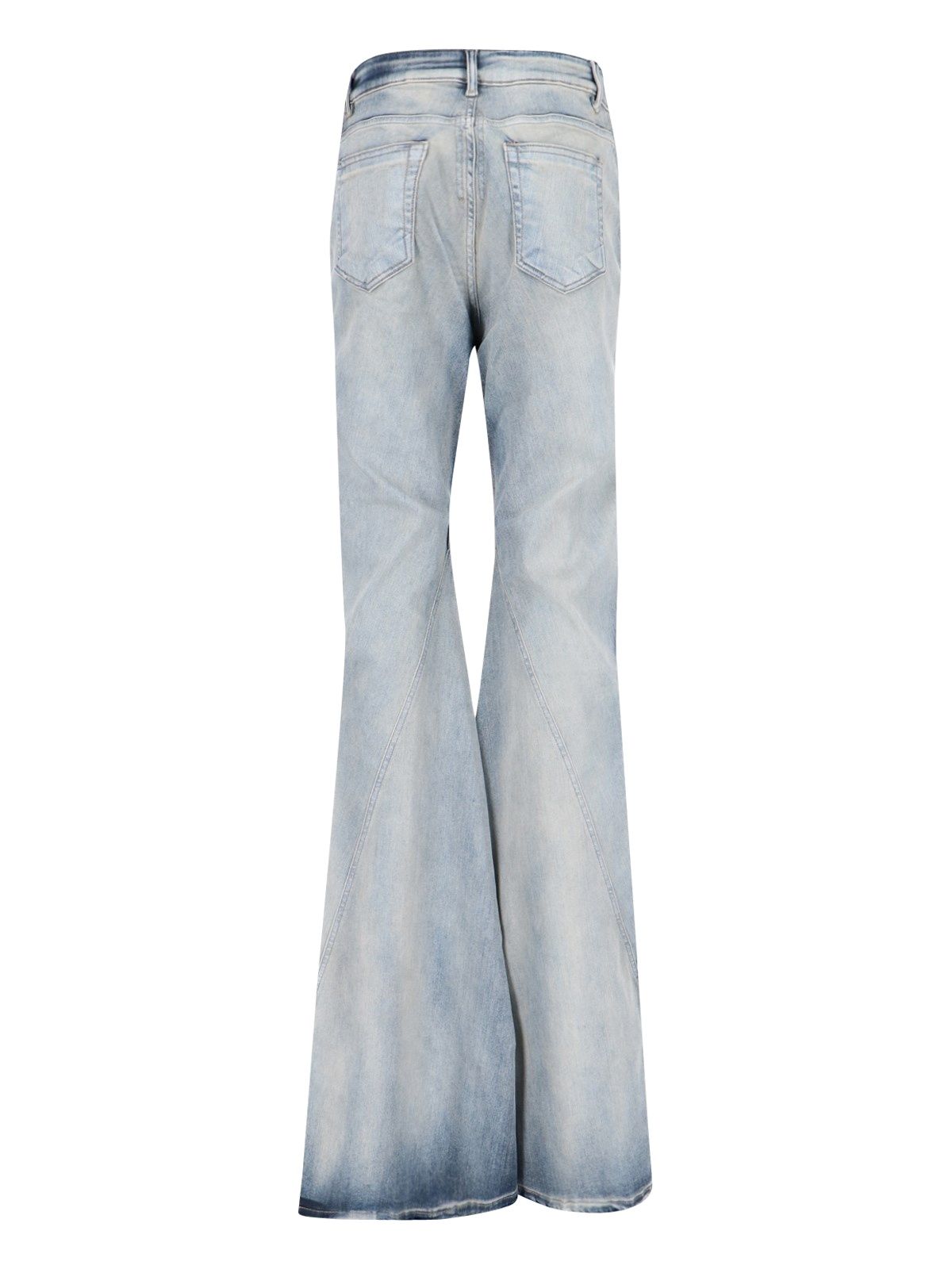Jeans bootcut "Porterville Bias" Rick Owens DRKSHDW, in denim stretch azzurro, lavaggio usured, a vita media, passanti cintura, chiusura bottone e zip, design sei tasche, due pinces fronte, gamba larga, dust bag inclusa.