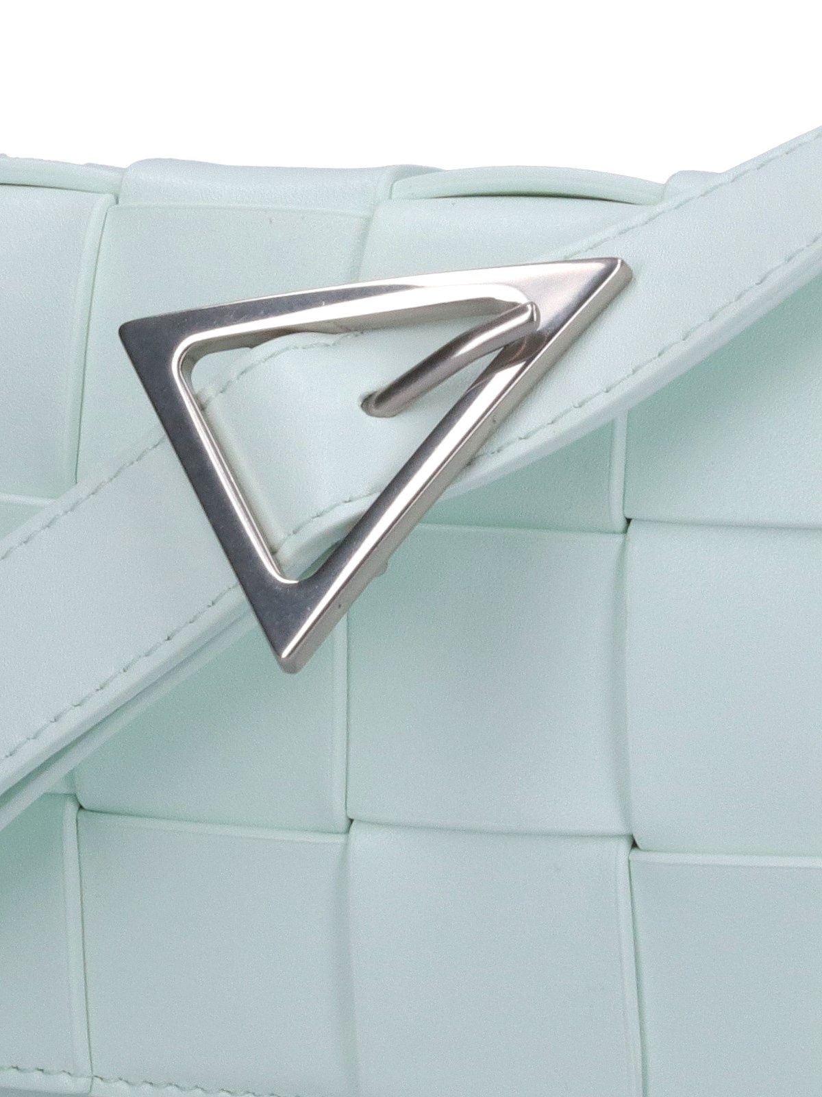 Borsa tracolla piccola "Cassette" Bottega Veneta, in pelle azzurra, motivo iconico intrecciato, tracolla regolabile, fibbia argentata, chiusura bottone magnetico, scomparto interno unico.