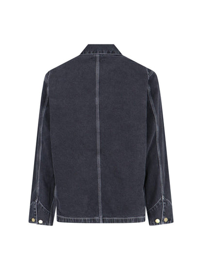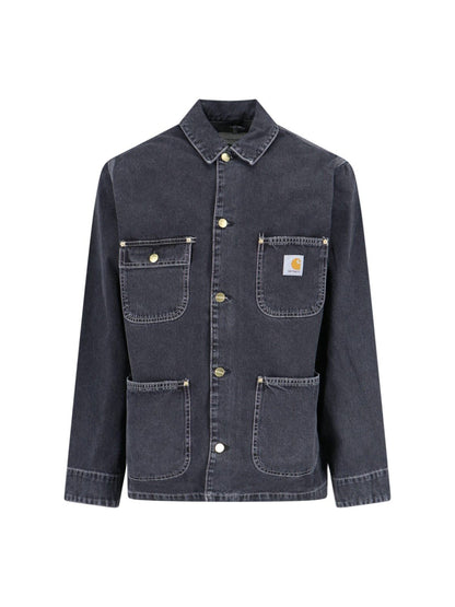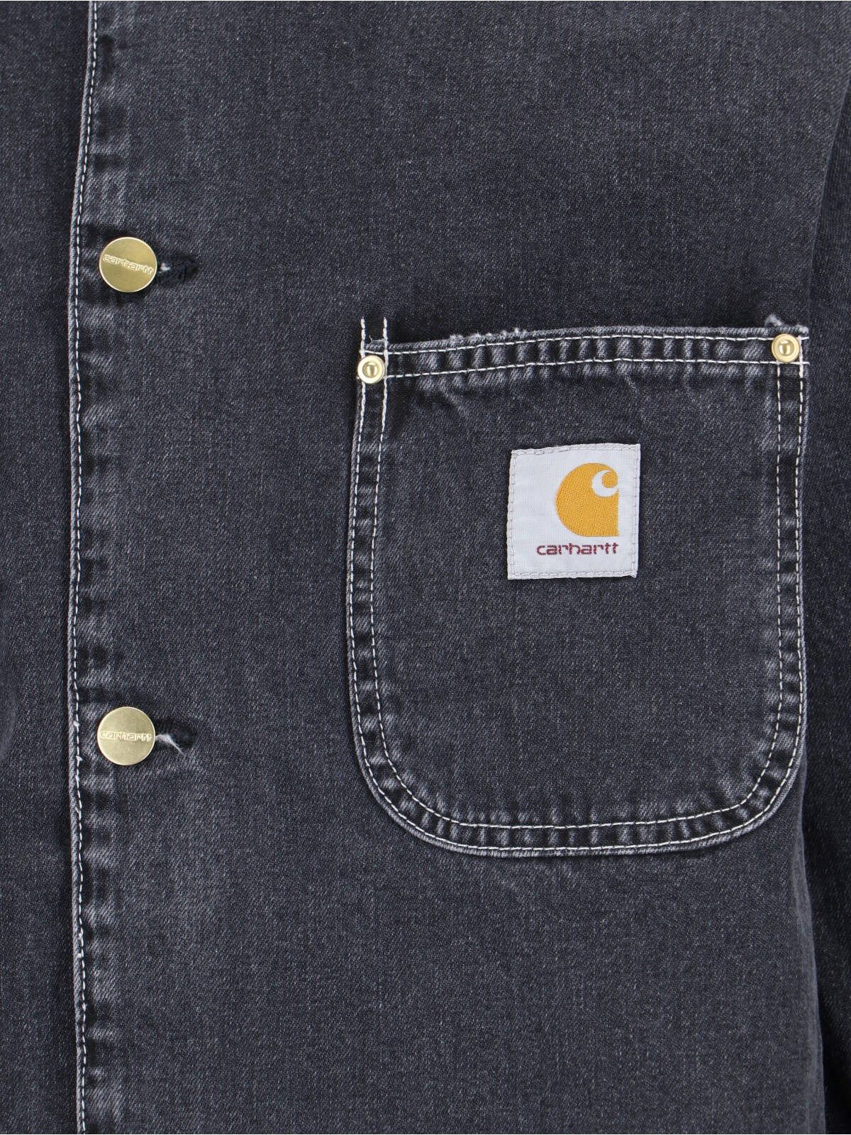 Giacca da lavoro "OG Chore" Carhartt WIP, in denim nero, colletto classico, chiusura bottoni, una tasca patta bottone petto, tre tasche piatte fronte, dettaglio etichetta logo, bottoni polsini, orlo dritto.