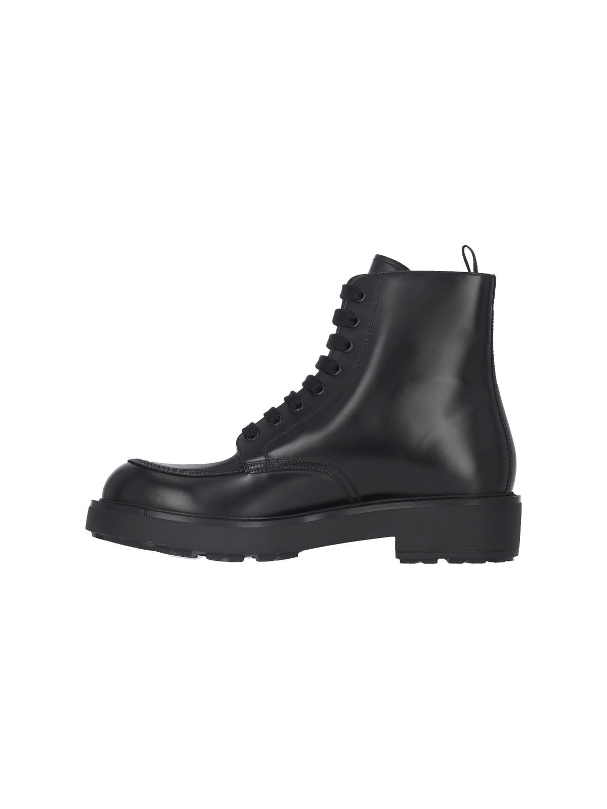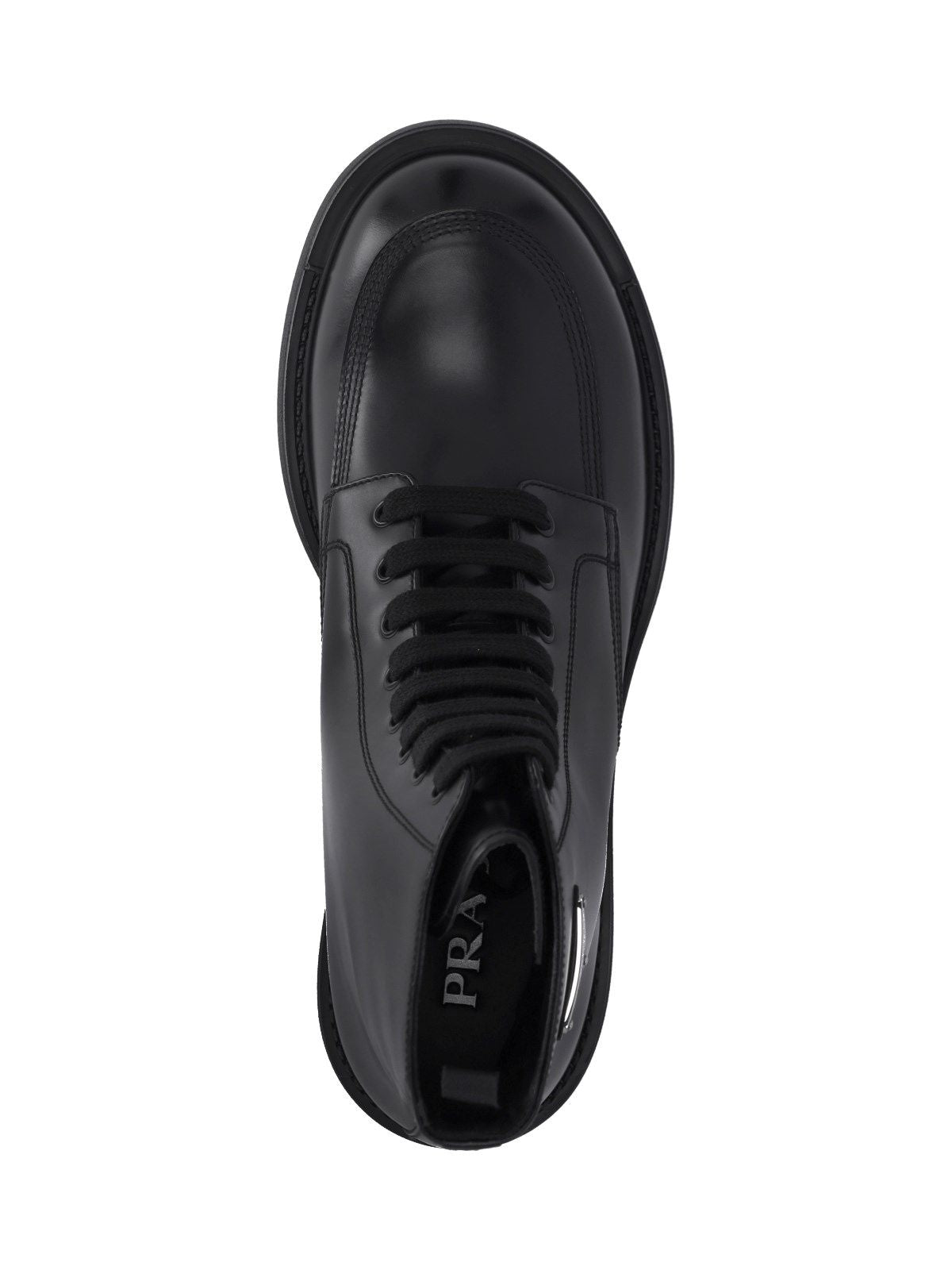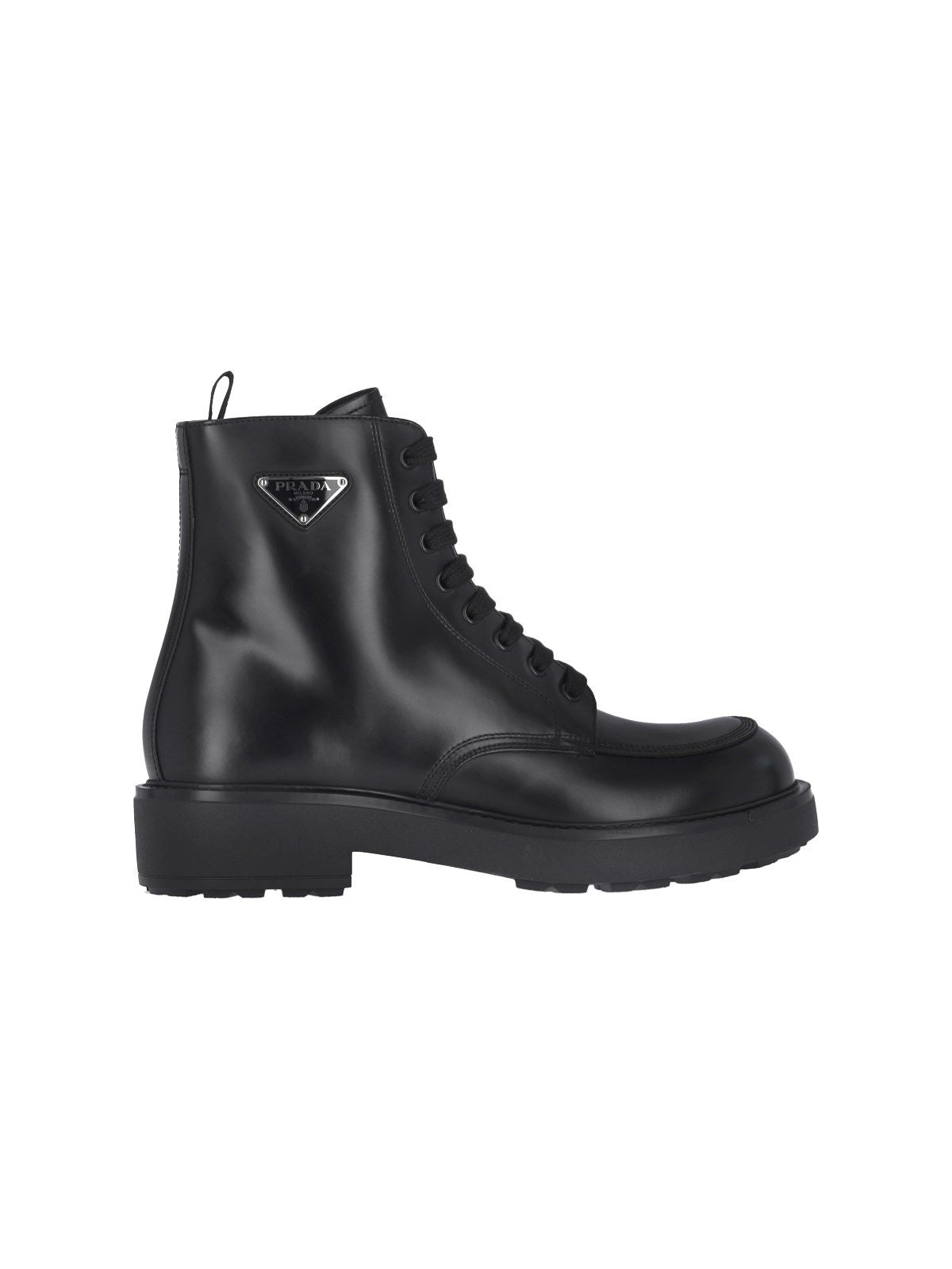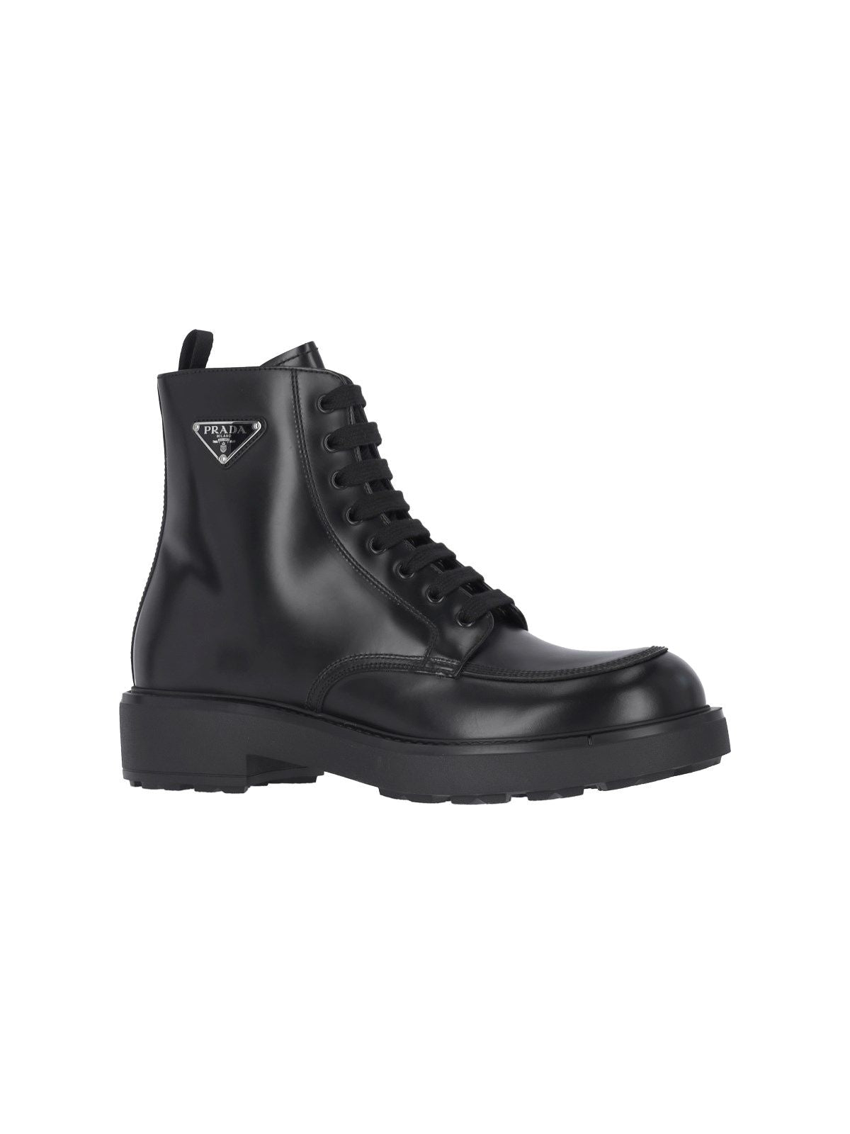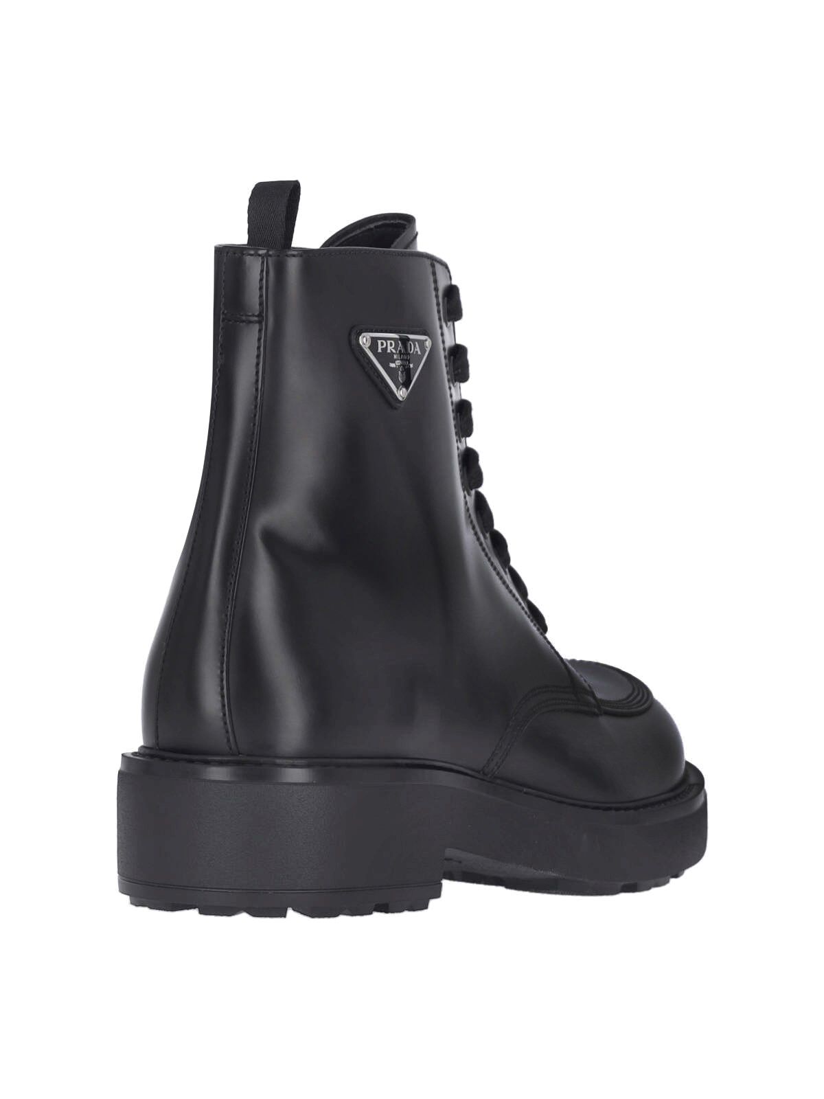 Stivaletti logo Prada, in pelle spazzolata nera, dettagli tono su tono, punta tonda, chiusura lacci, logo triangolo in metallo smaltato laterale, linguetta in gros grain superiore retro, suola in gomma.