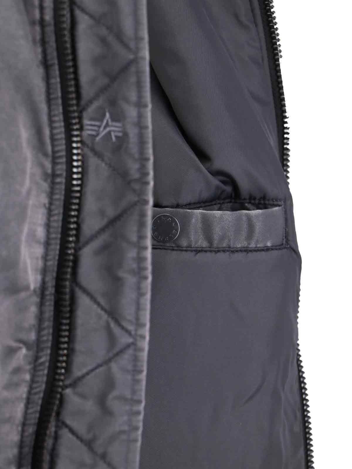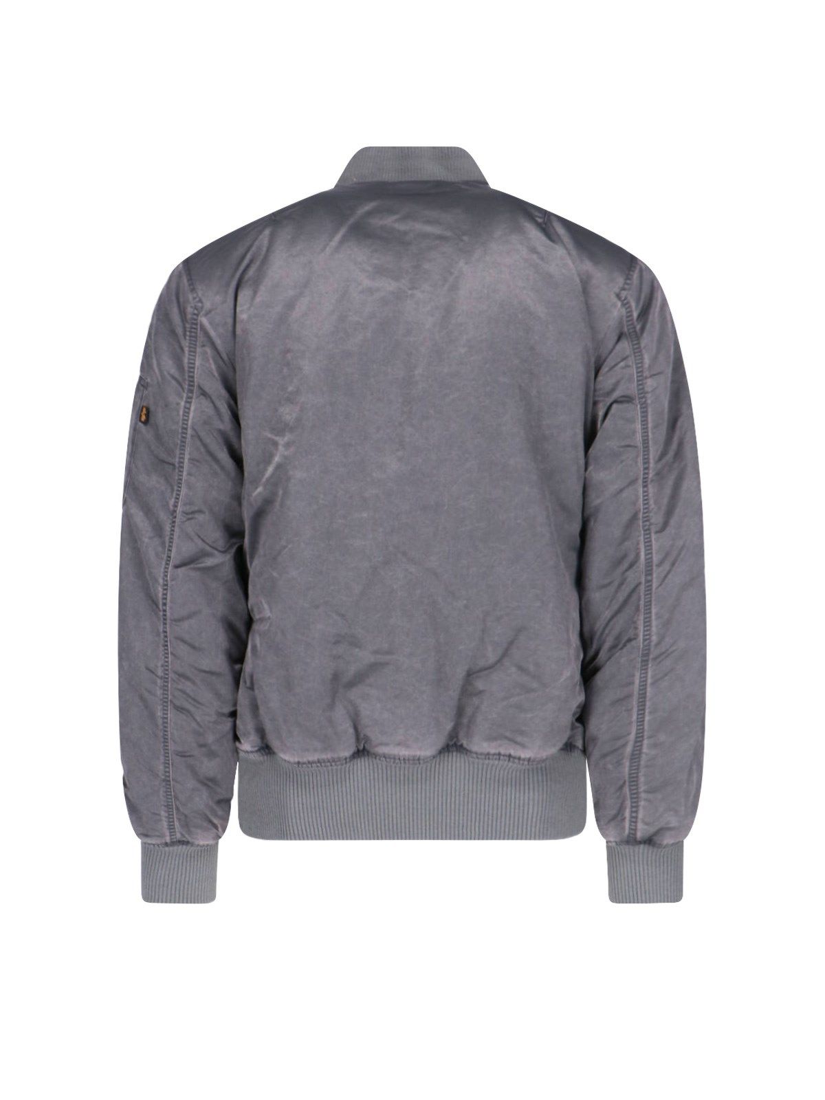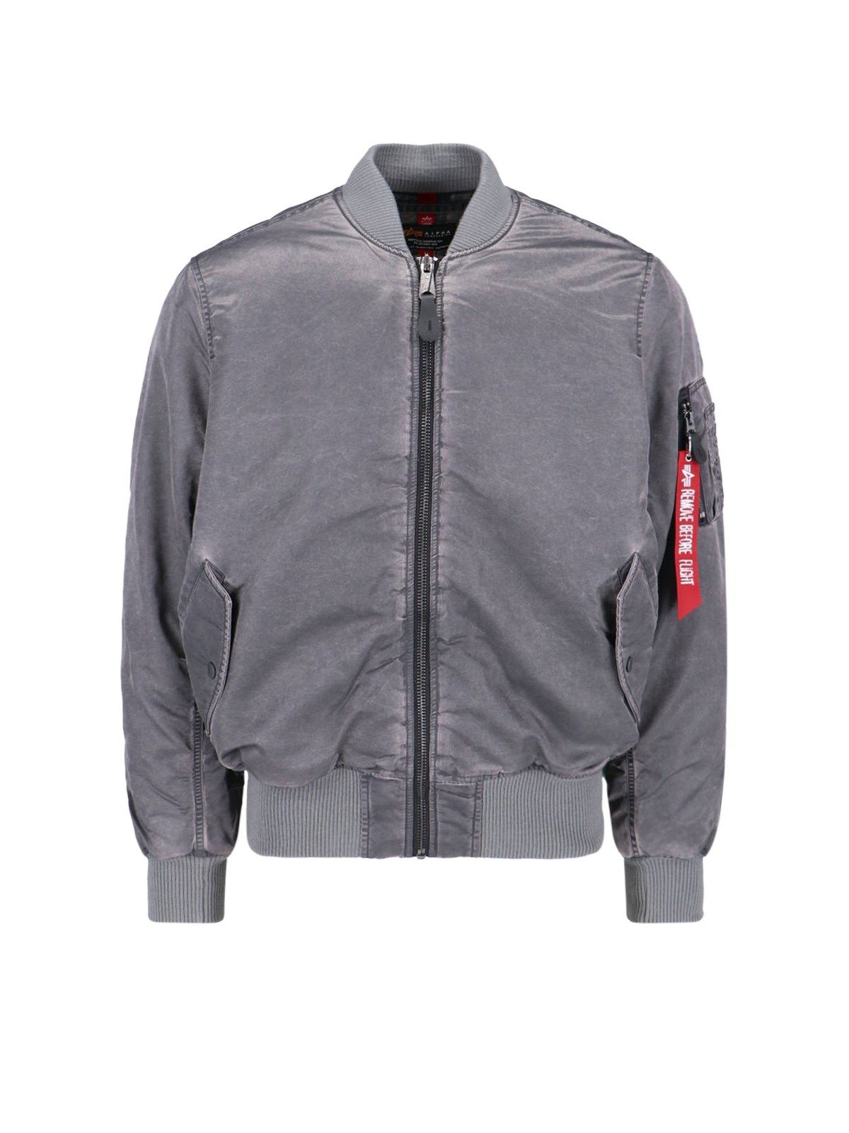 Giacca bomber "MA-1" Alpha Industries, in nylon grigio, effetto usured, girocollo, chiusura zip, due tasche a soffietto laterali, una tasca applicata con zip su manica, dettaglio tiralampo etichetta rossa, una tasca intrna, finiture a costine, polsini e orlo elastico.