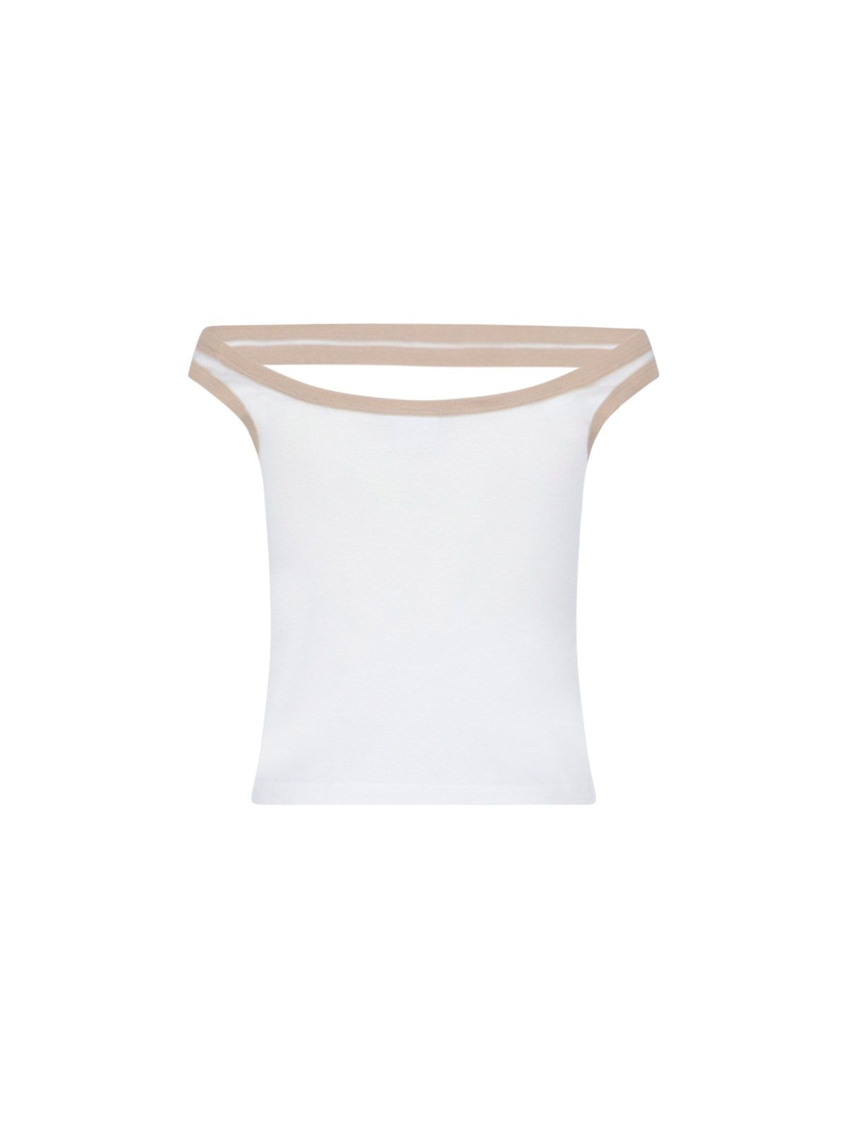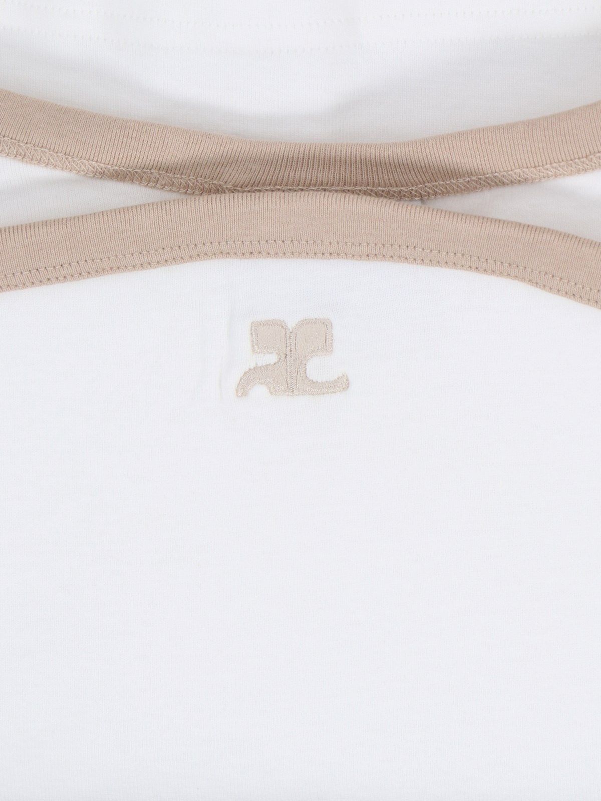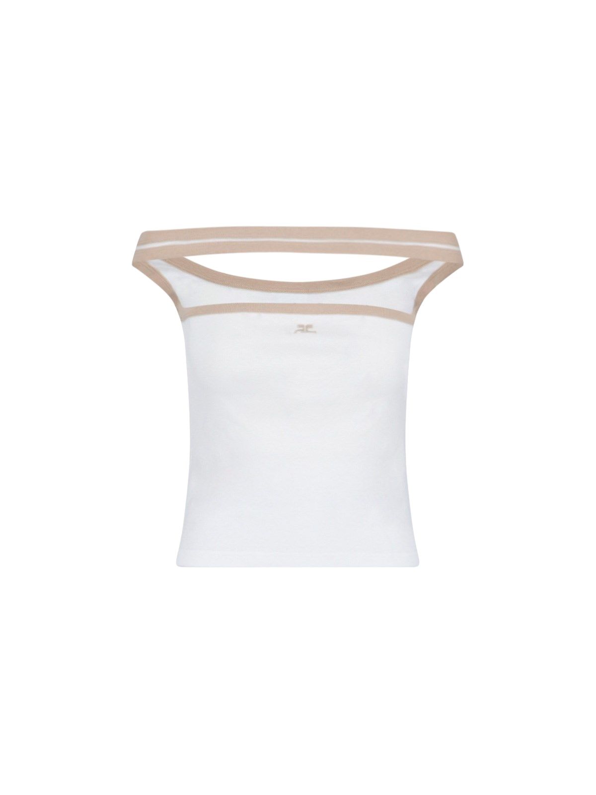 Top "Hyperbole Contrast" Courrèges, in cotone bianco, scollo a barca dettaglio cut-out fronte, finiture a contrasto beige, ricamo logo beige fronte, orlo dritto.