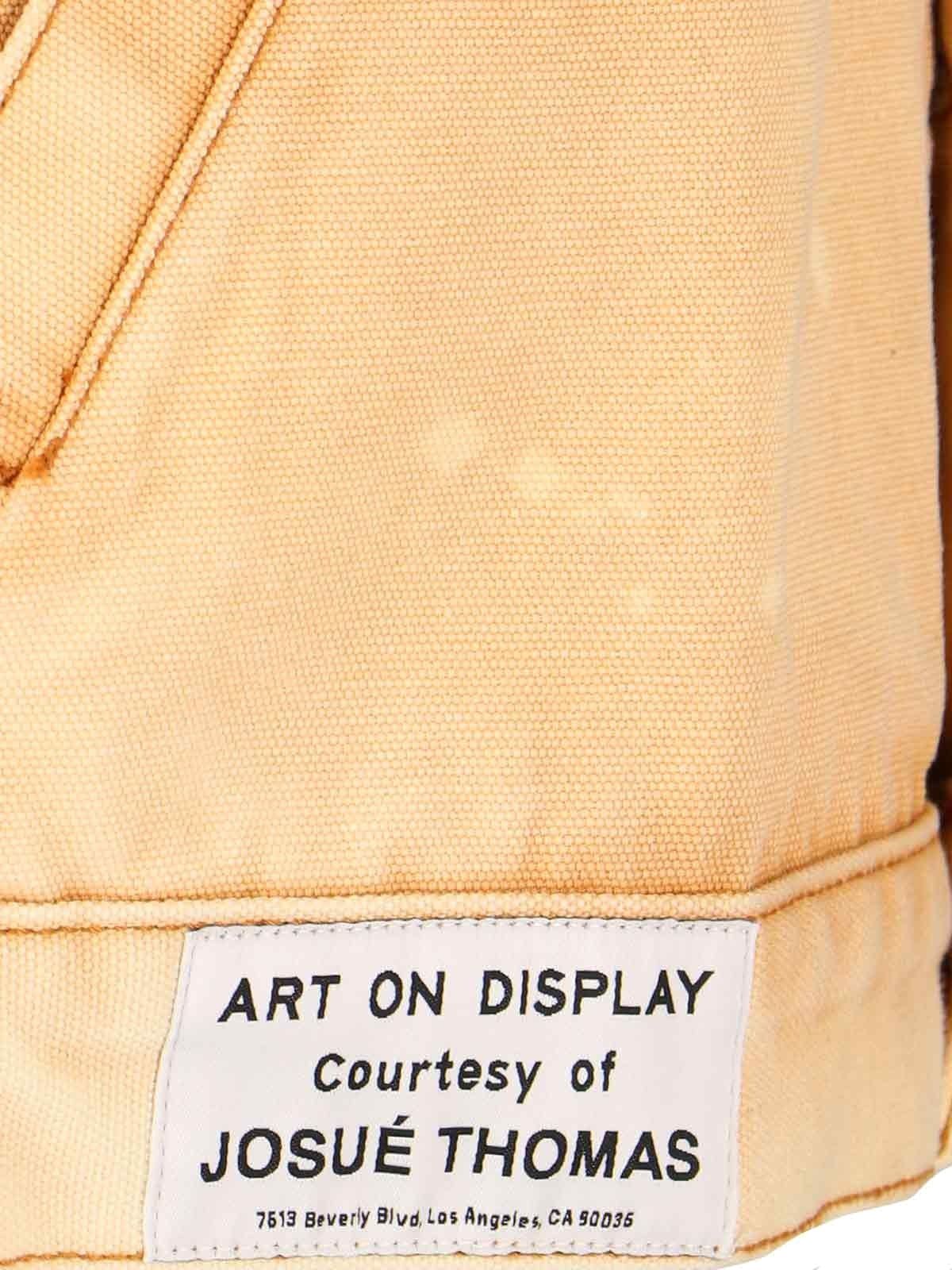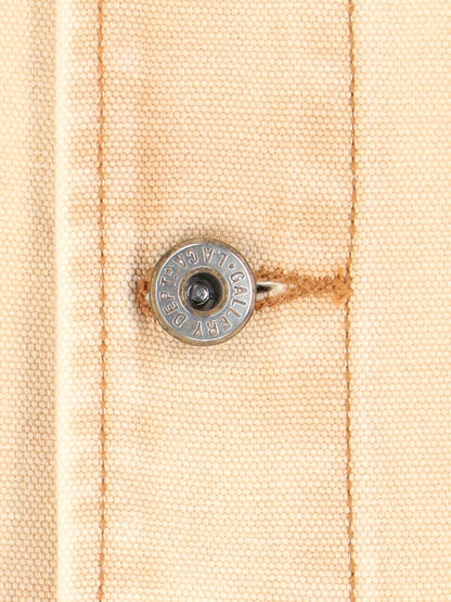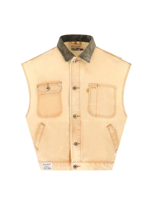 Gilet "Logan" Gallery Dept., in cotone beige, lavaggio usured, colletto classico grigio, senza maniche, chiusura bottoni, due tasche laterali, due tasche applicate petto, etichetta "art on display" bianca fronte, etichetta logo tono su tono retro, bottoni su fondo.