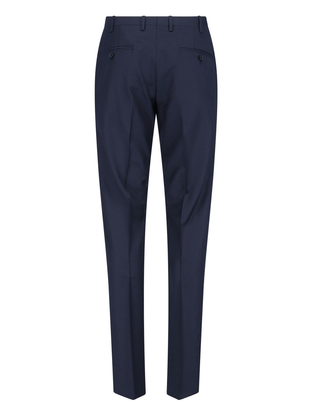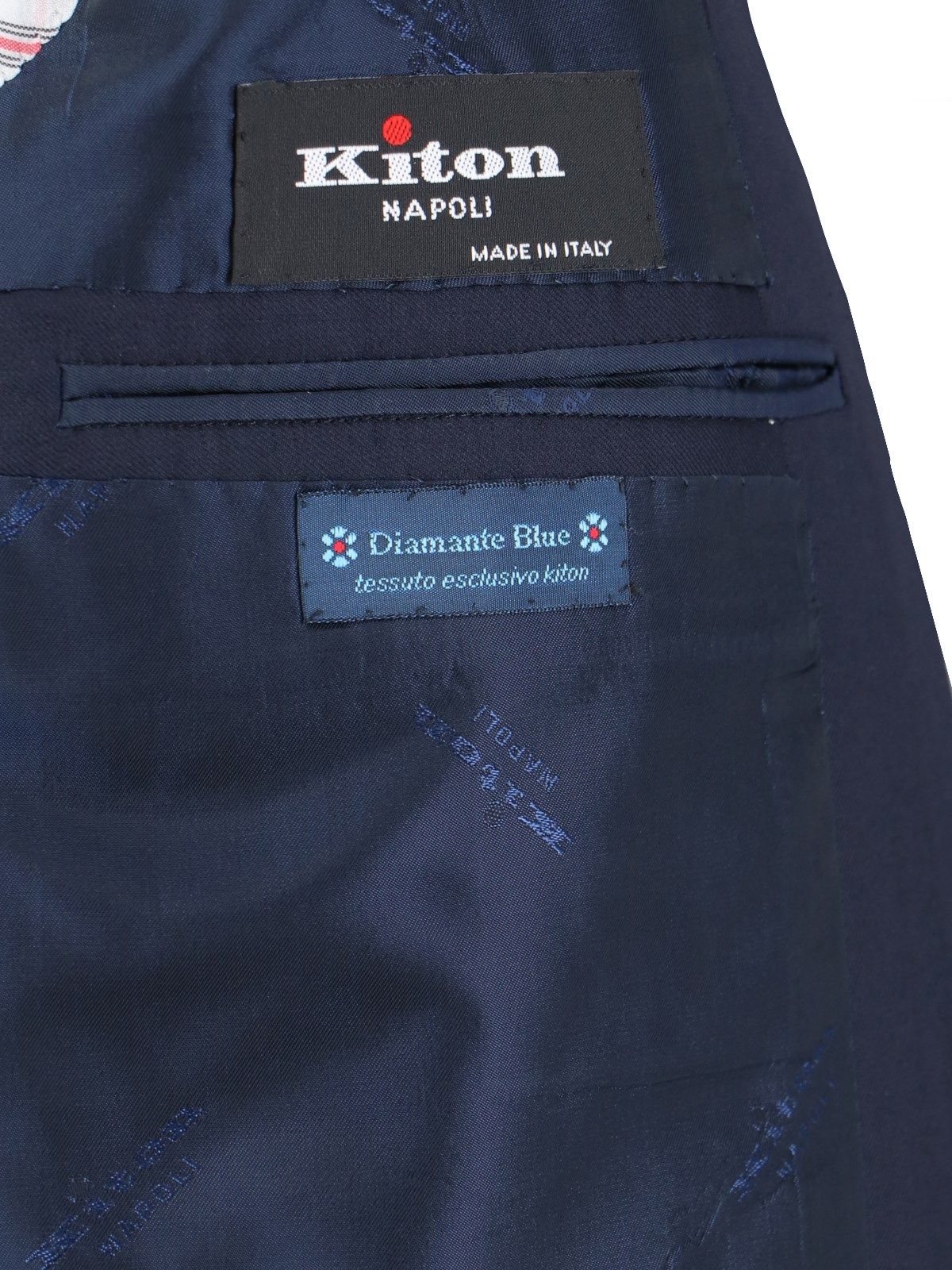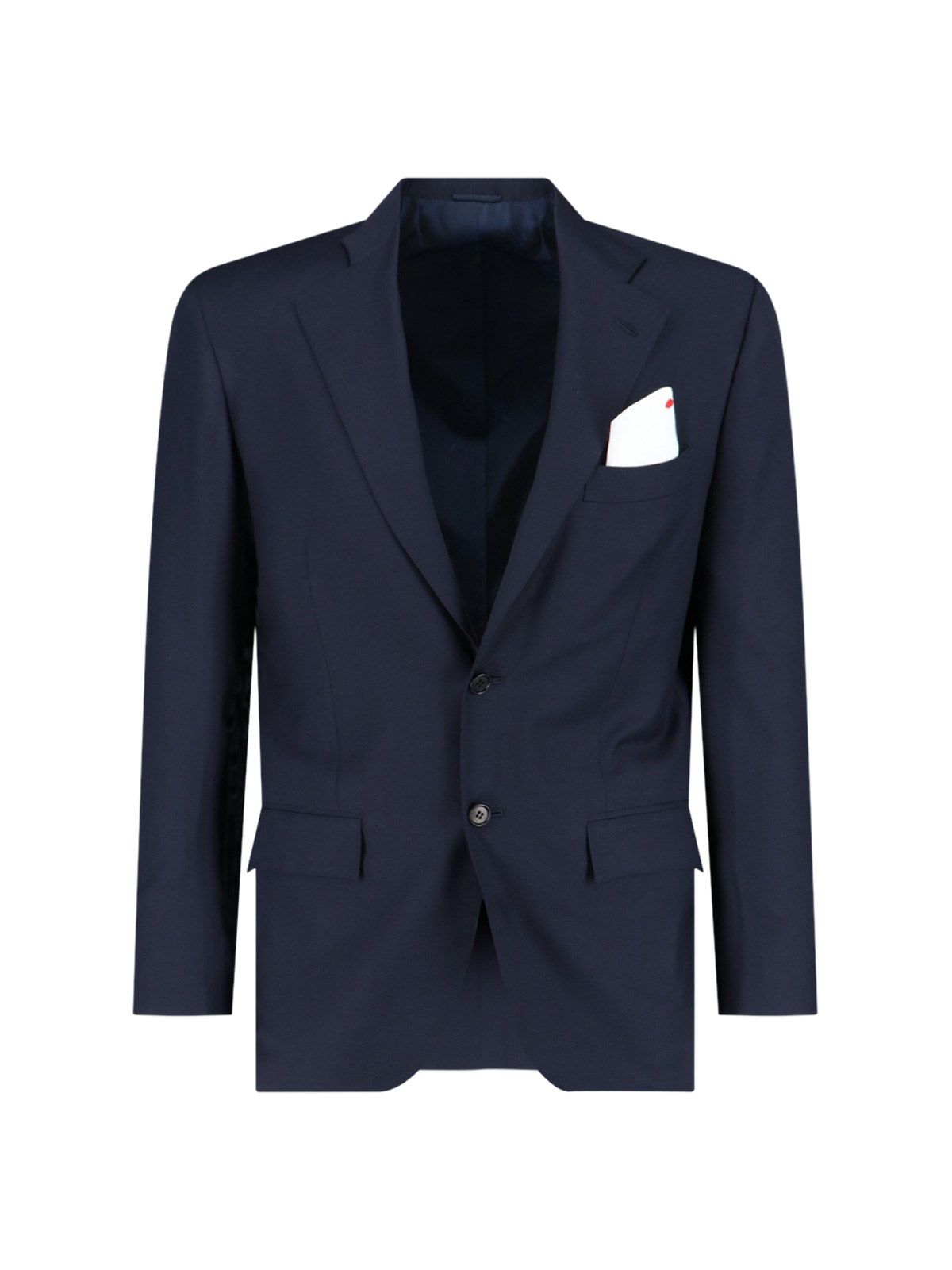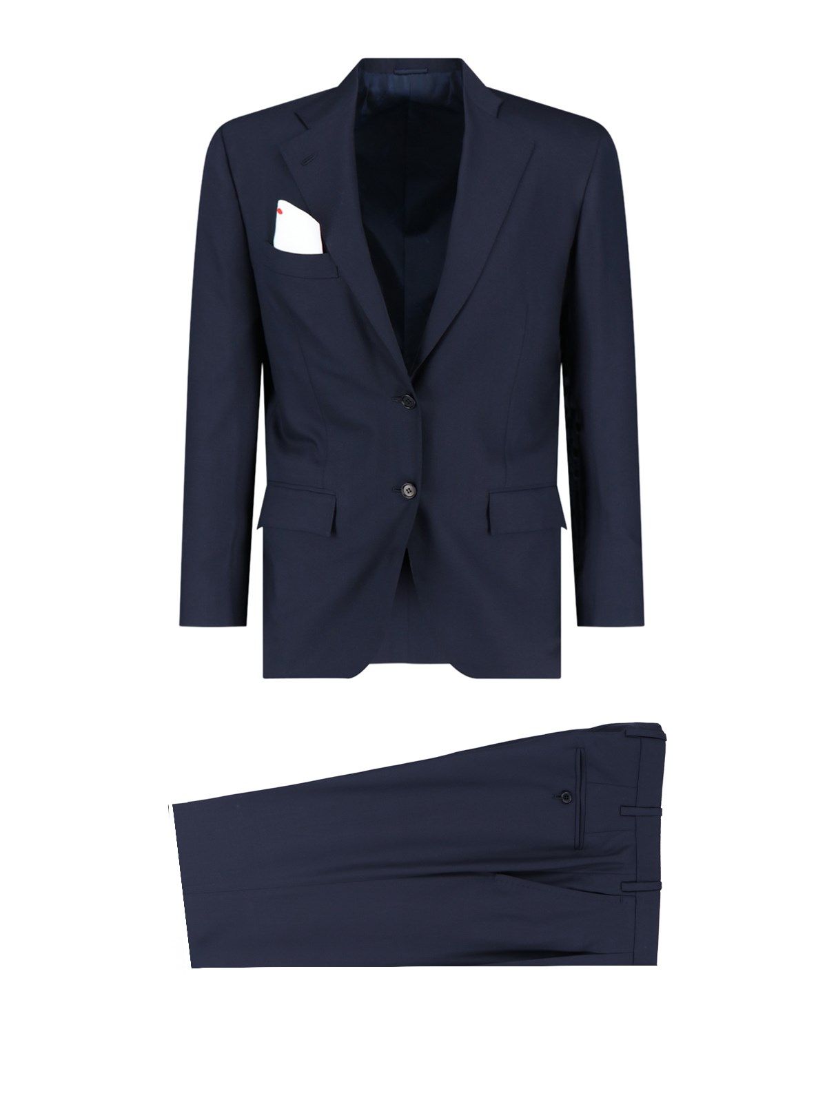 Completo monopetto Kiton, in lana blu, revers classici, chiusura bottoni, una tasca filetto petto, due tasche fronte, bottoni polsini, orlo dritto.