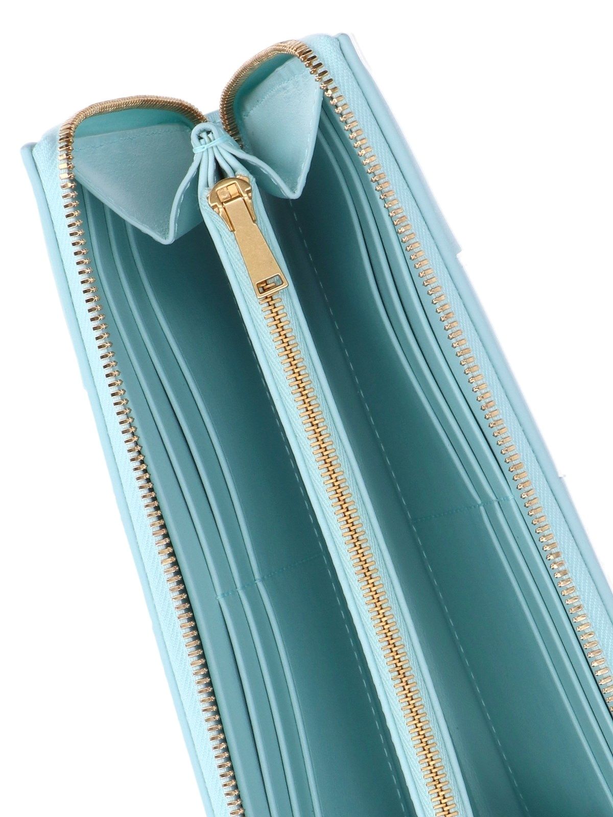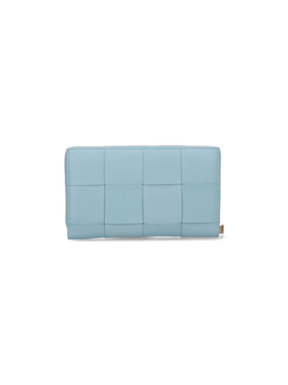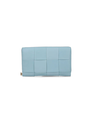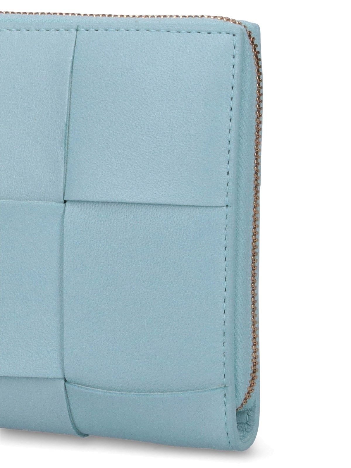 Portafoglio Intrecciato Bottega Veneta, in pelle azzurra, chiusura zip, una tasca zip centrale interna, due scomparti interni separati, vari slot carte interni.