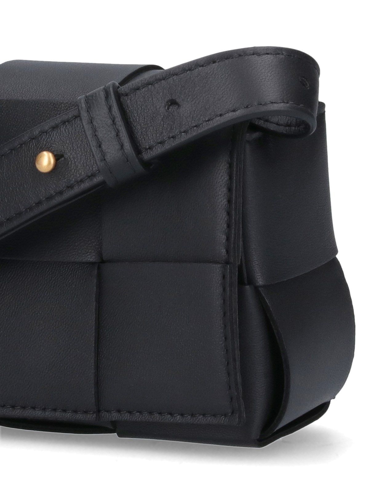 Borsa "Candy Cassette" Bottega Veneta, in pelle nera, motivo intrecciato, chiusura bottone magnetico, una tracolla regolabile, uno scomparto interno principale, uno slot carte interno.
